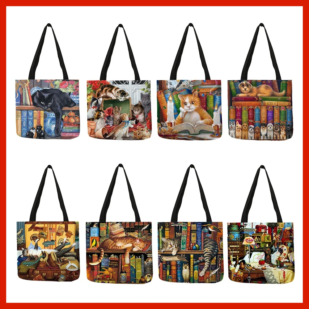 Женская дизайнерская сумка-тоут с принтом кота, льняная многоразовая сумка для покупок, сумки на плечо для леди, 2022