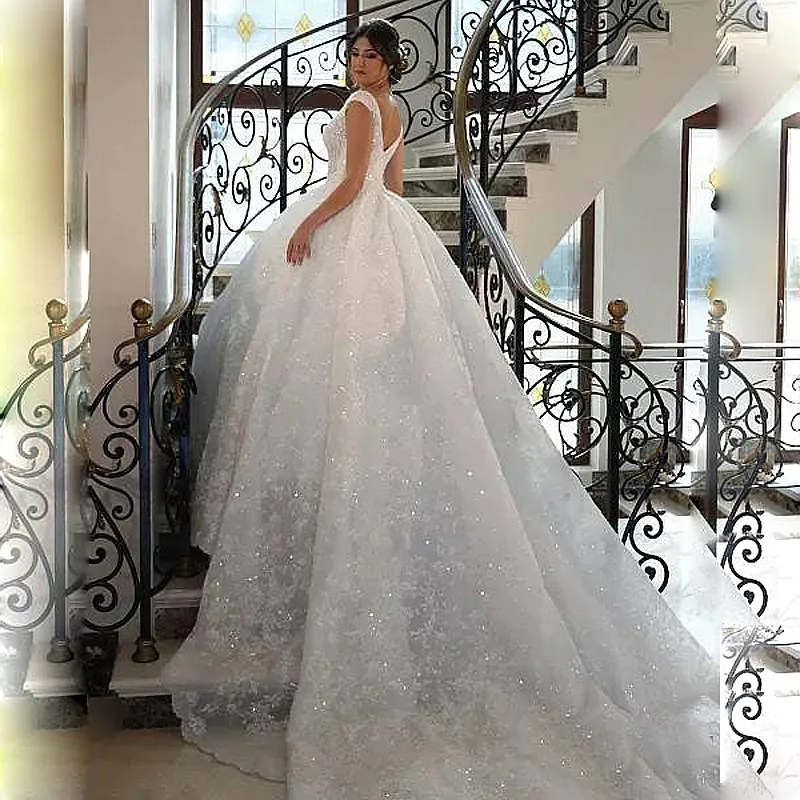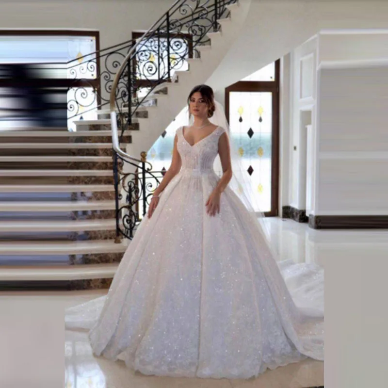 Классическое женское свадебное платье с V-образным вырезом и длинным шлейфом