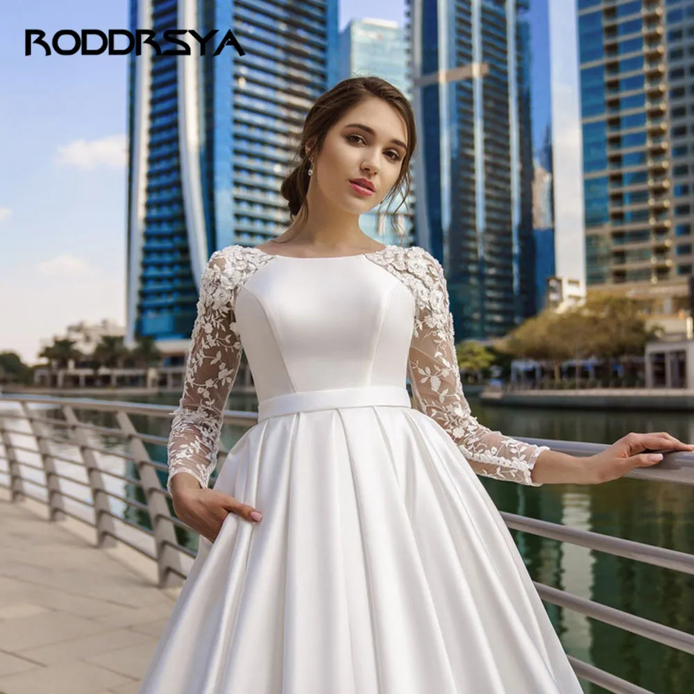 Сдержанные Свадебные платья из Дубая RODDRSYA, кружевные атласные платья невесты с длинным рукавом и поясом, женские элегантные свадебные платья