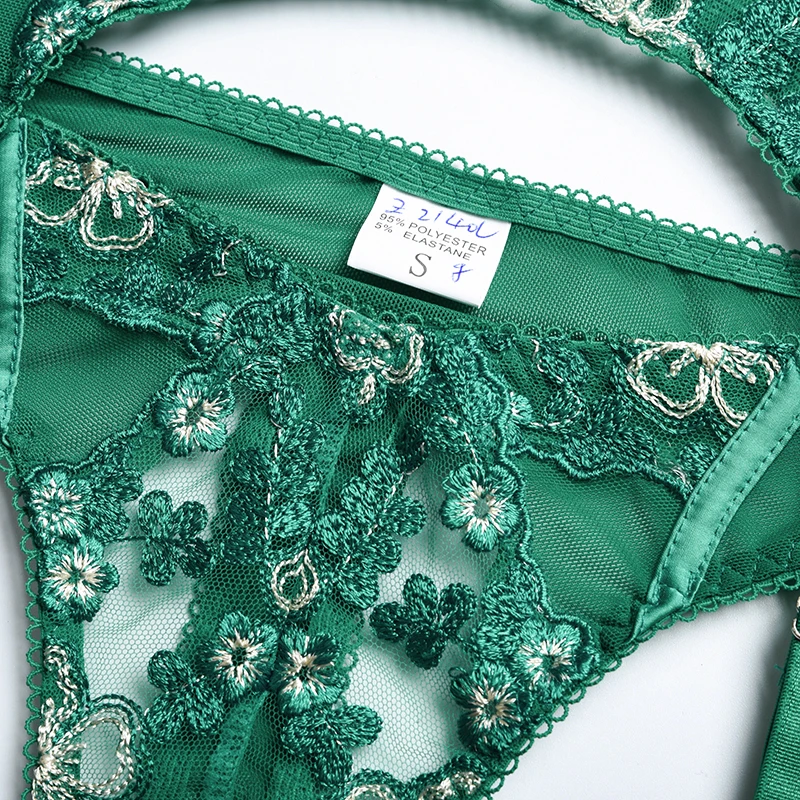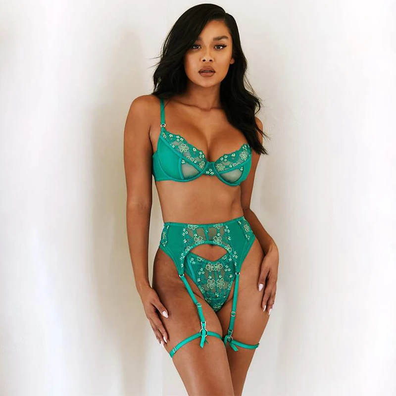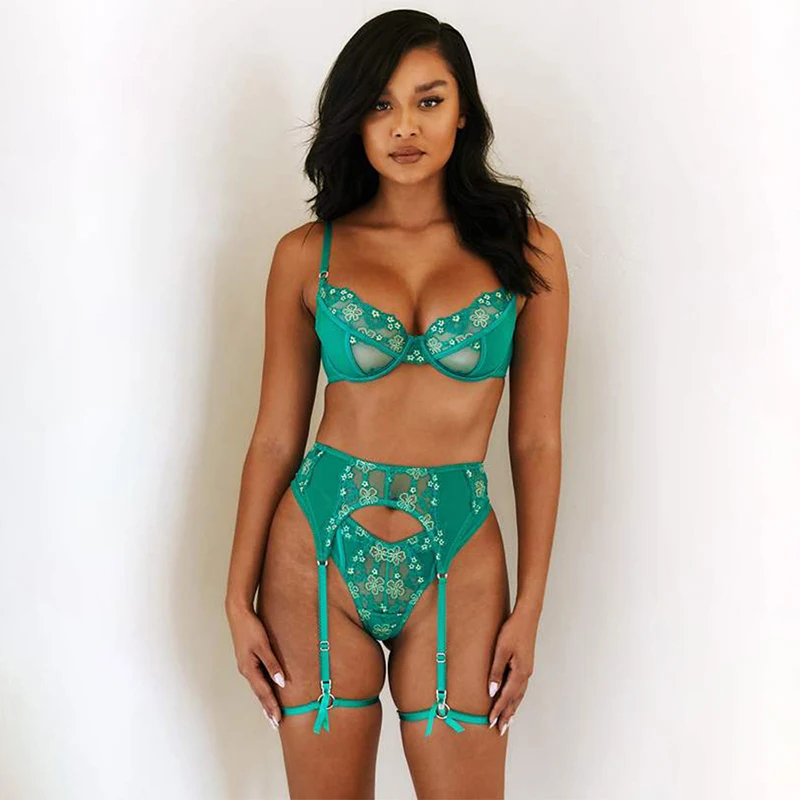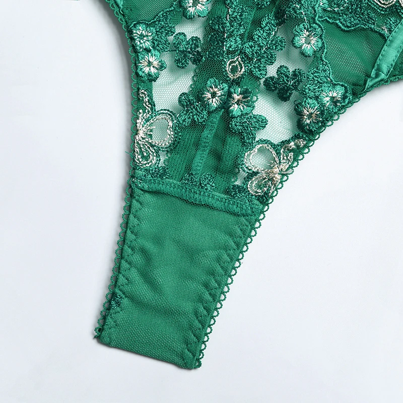 Зеленый комплект нижнего белья для женщин, 3 предмета, необычное вышитое нижнее белье, экзотические сексуальные кружевные чувственные трусы, комплект с подвязками для женщин