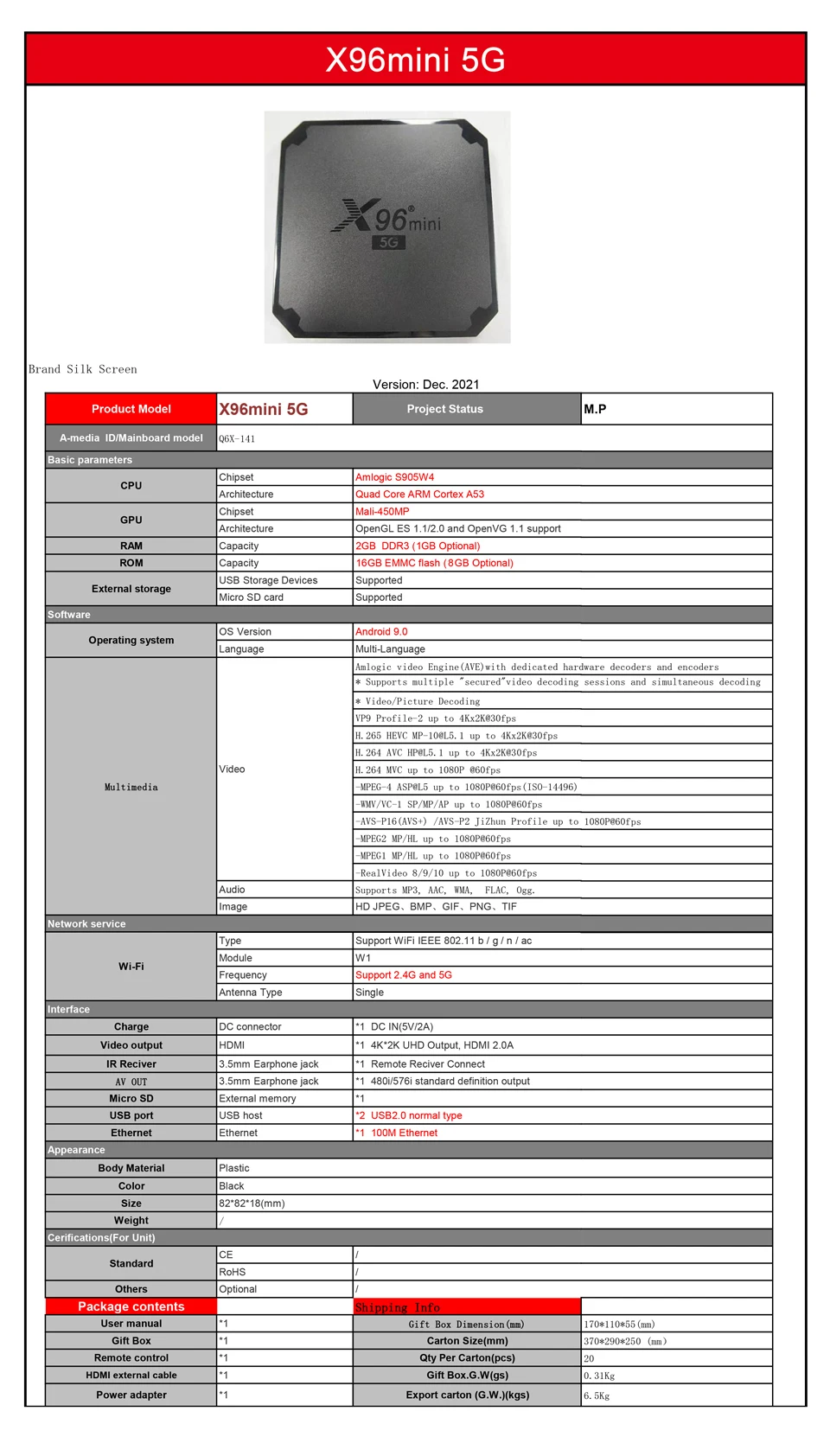 Номер моделиX96mini 5G TV BOX
