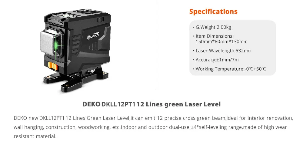 Лазерный уровень DEKO DKLL12PT1 с 12 зелеными линиями Лазерный уров...