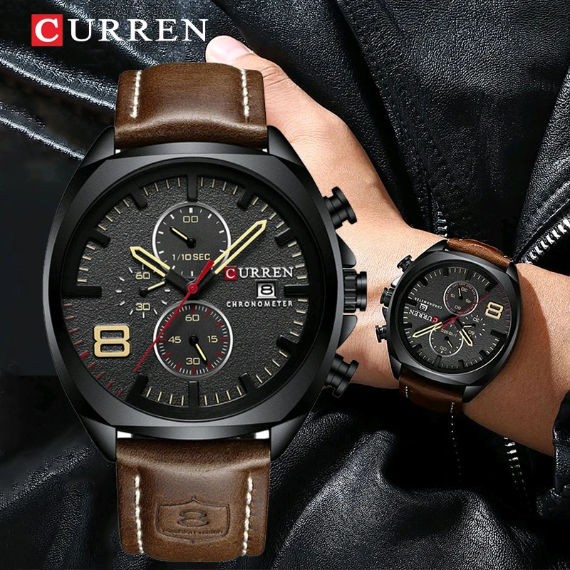 Часы наручные CURREN Мужские кварцевые, модные деловые аналоговые спортивные водонепроницаемые в стиле милитари, с кожаным ремешком, Прямая поставка