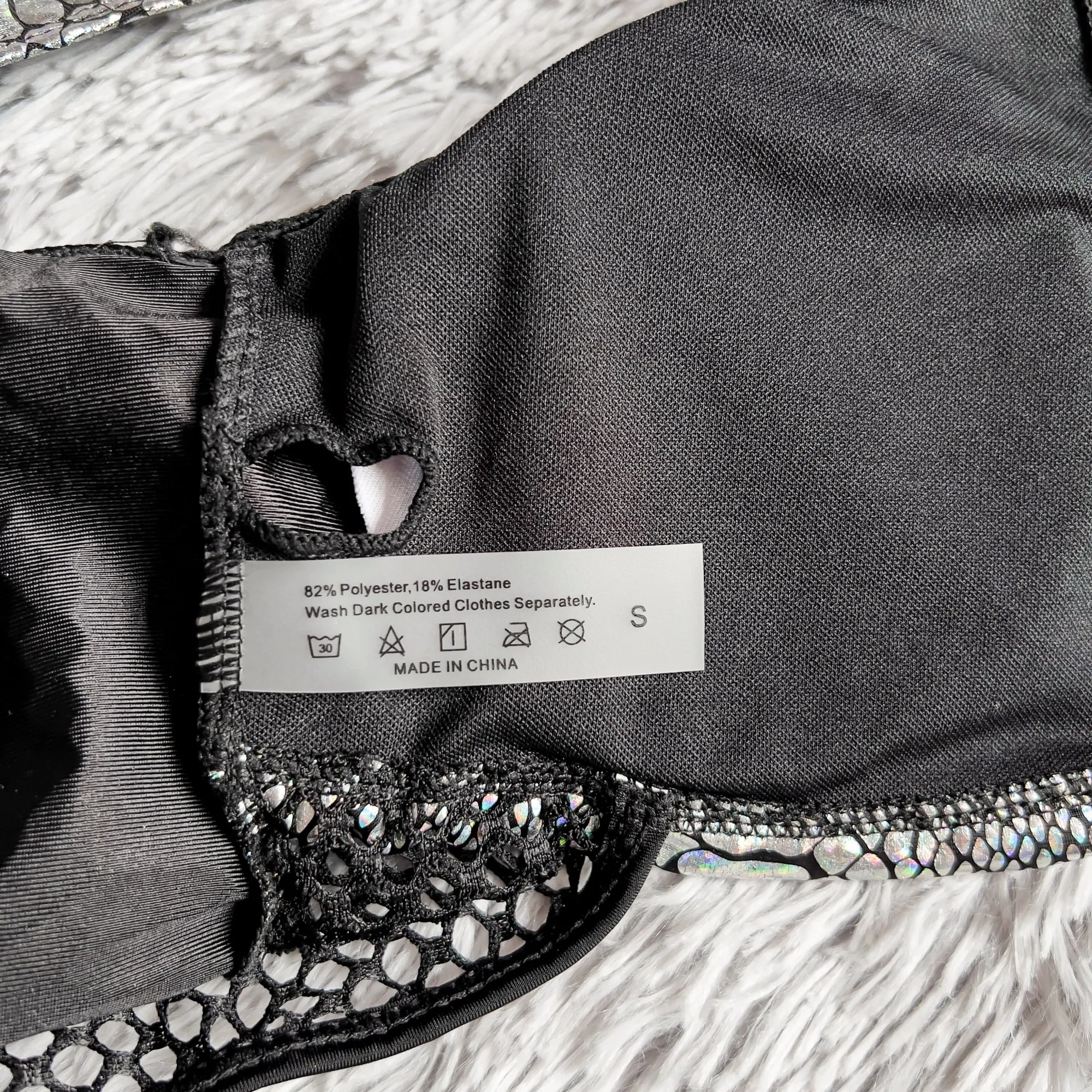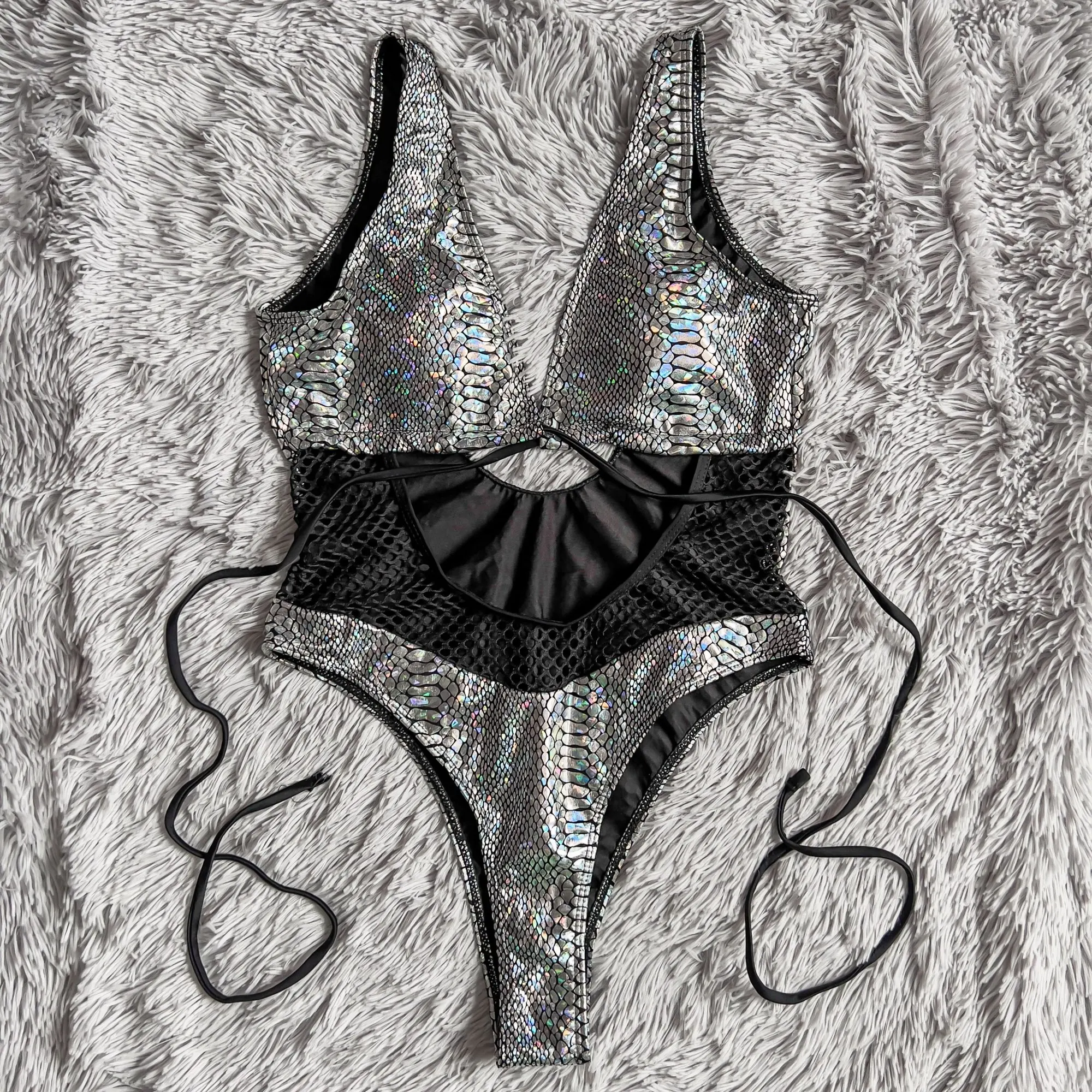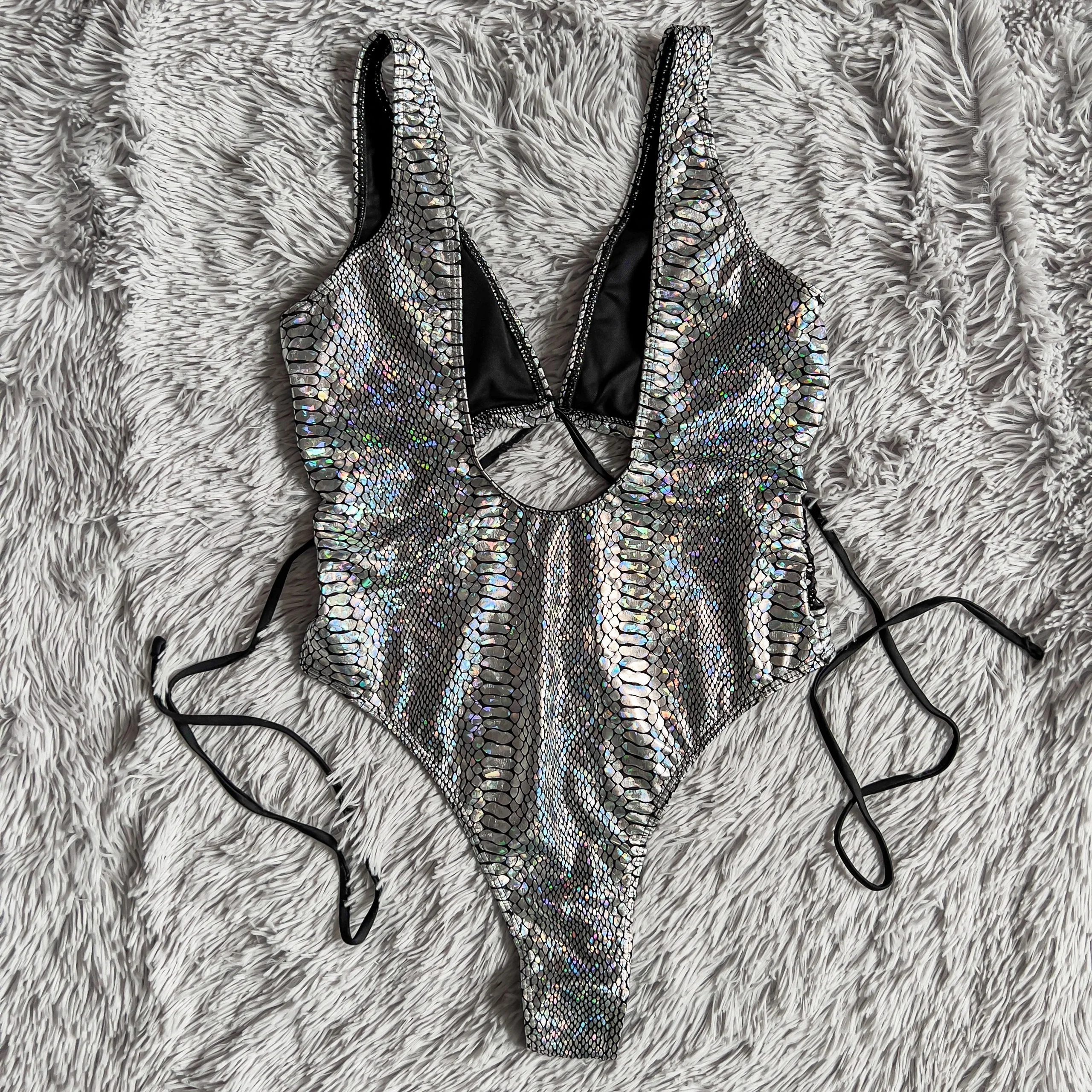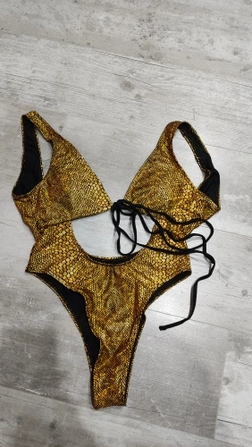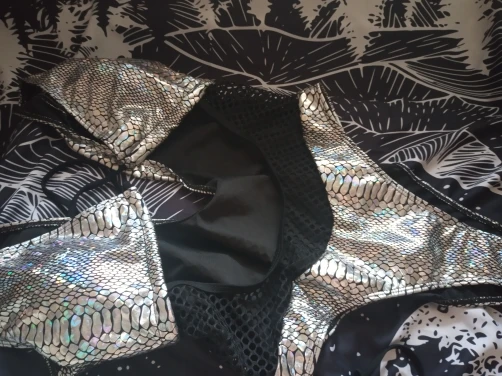 Стильный купальник. С лицевой стороны голографический материал, подкладка чёрного цвета. Не просвечивает, эластичный. На параметры 84/64/92 подошёл размер S. Подробный обзор есть у меня в Ins, найти меня можно по нику inna_kovski
