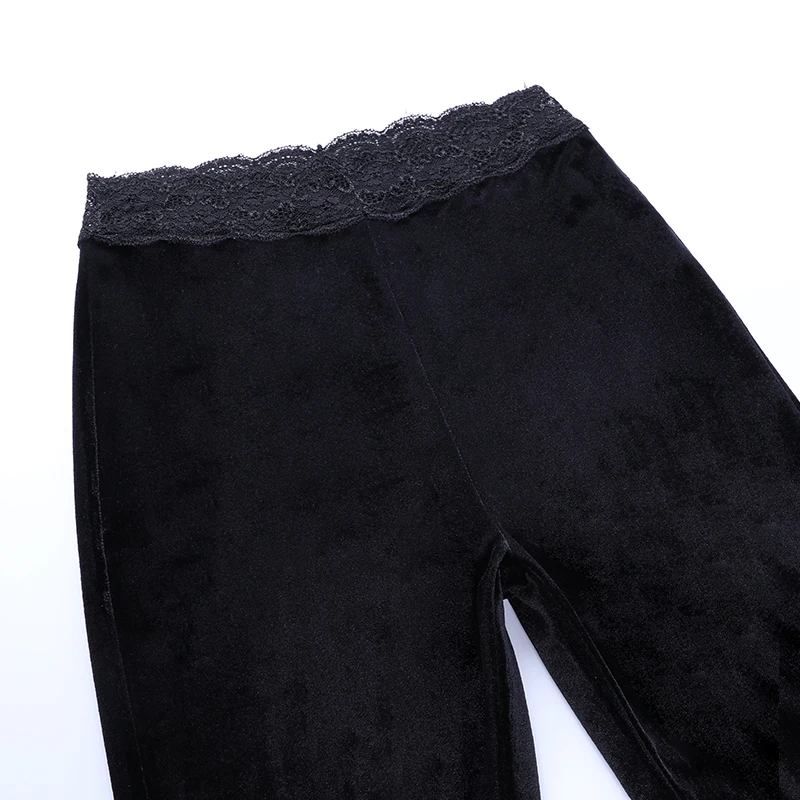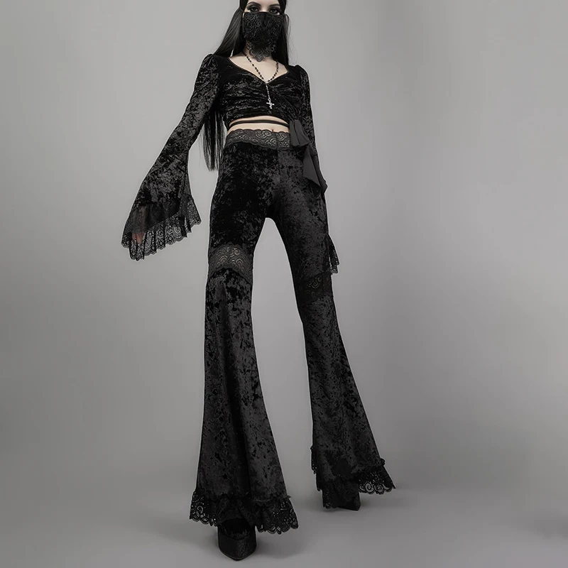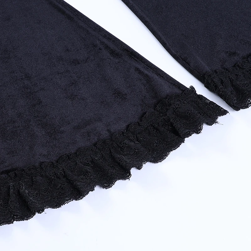 Y2K готические черные расклешенные брюки винтажные эстетические бархатные брюки с высокой талией Элегантные сексуальные кружевные длинные брюки для женщин уличная одежда