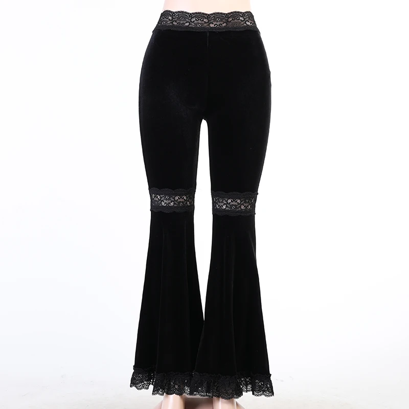 Женские винтажные бархатные брюки Y2K, черные готические расклешенные брюки с высокой талией, элегантные сексуальные кружевные длинные брюки для улицы