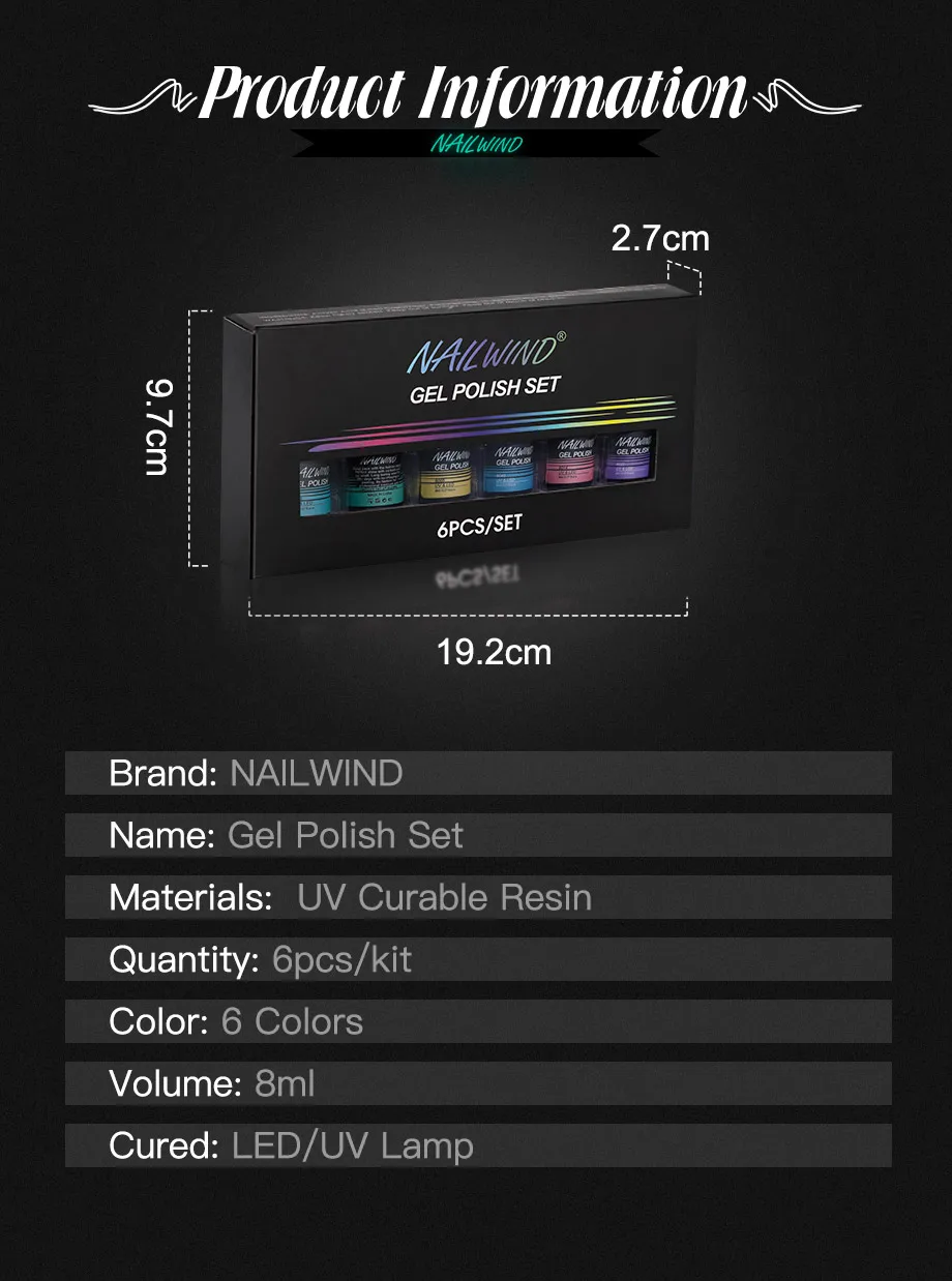 Характеристики Товара:Бренд: NAILWINDНазвание: набор гель-лакаМатериалы: УФ-изгибаемая смолаКоличество: 6 шт./партияОбъем: 8 млИзлеченный: светодиодный/УФ-лампа-Качество-наш первый приоритет.-Светильник, почти без запаха (только верхнее покрытие и основа имеют умеренный запах), мы применяем только органическую текстуру для защиты вашего здоровья.-Цвет будет сиять до 30 дней.-Цвета на выбор, подходят для всех случаев.Шаг за шагом:1. Форма ногтя. Слегка смочите поверхность ногтевой пластины. Дезинфицировать.2. Нанесите базовый слой основы от кутикулы до свободного края (не забудьте запечатать край ногтя). Высушите ногти под светодиодный светильник в течение 10 секунд или УФ-светильник в течение 2 минут.3. Нанесите тонкое пальто отмачиваемого геля на выбор. Свободный край крышки. Лечение: 30 секунд в светодиодный светильник, или 2 минуты в УФ-лампе.4. Повторите 2-е тонкое покрытие отмачиваемого гель-лака на ногти. Высушите под светодиодный лампой в течение 30 секунд или УФ-светильник в течение 2 минут.5. Нанесите верхнее пальто. Свободный край крышки. Лечение: 30 секунд в светодиодный светильник.6. Удалите липкий остаток на ногтях с помощью очищающего средства. Затем нанесите питающее масло кутикулы для увлажнения влаги в кутикулу и кожу вокруг ногтя.Для удаления:-1. Отмачивайте ногти в акриловом удалителе в течение 5 минут.-2. Аккуратно Наденьте на каждый ноготь всю эмаль для ногтей.Внимание:1. Объем составляет 8 мл. Поскольку емкость бутылки составляет более 8 мл, гель для ногтей не будет полностью заполнен бутылкой!2. Плотно закрываются. Держите подальше от солнечного света. Хранить в недоступном для детей месте.