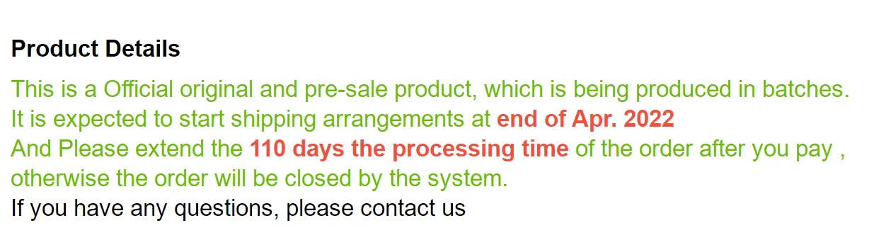 И, пожалуйста, продлите109 дней время обработки После оплаты заказа, в противном случае заказ будет закрыт системой.
