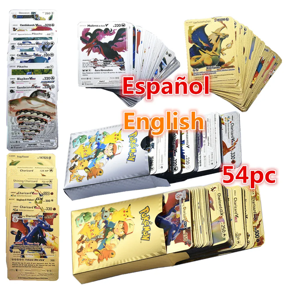 54 шт.кор. Испании, Покемон, металлическая Золотая карточная коробка, золотые буквы, металлические буквы, Charizard Vmax Gx, коллекционная игра