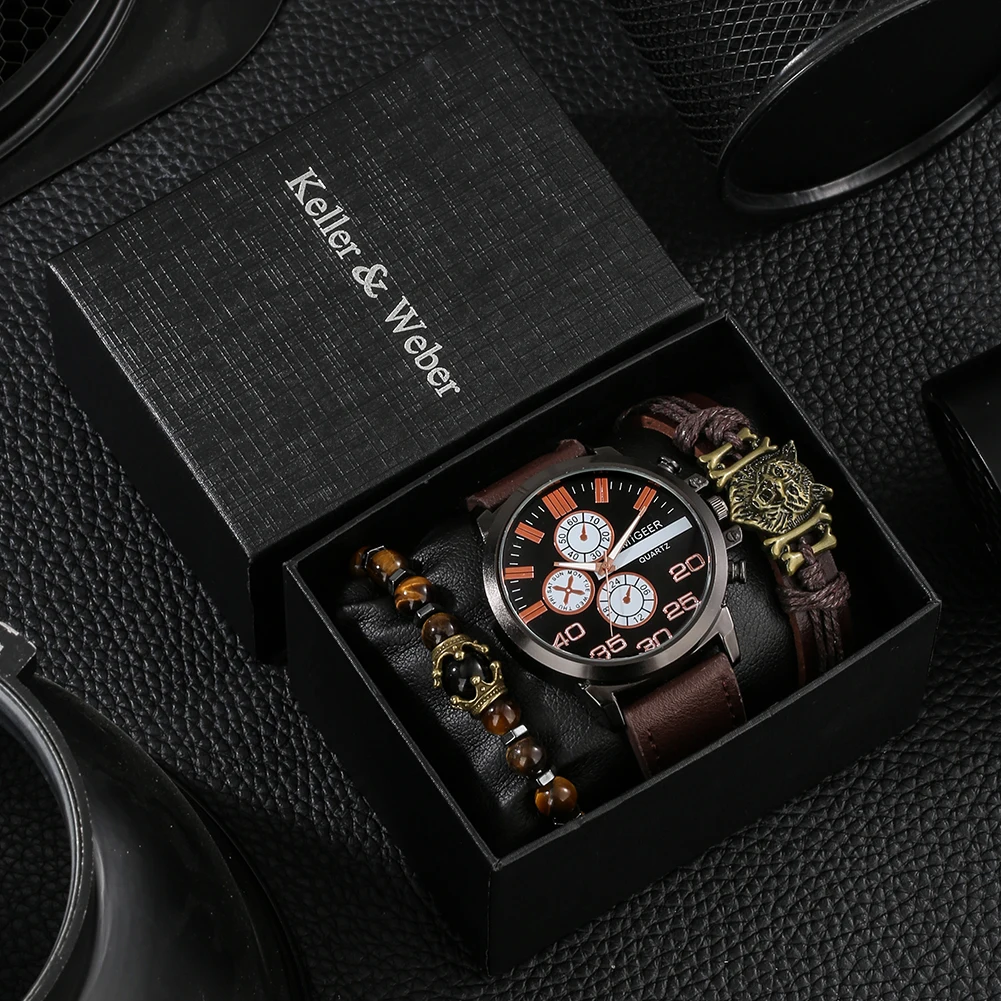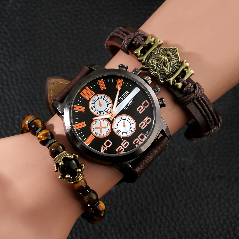 Мужские часы в комплекте, коричневый ремешок, кварцевые часы, браслет, подарочный набор, корона, волк, дизайнерские кожаные браслеты, мужские часы, подарок для мужчин с коробкой
