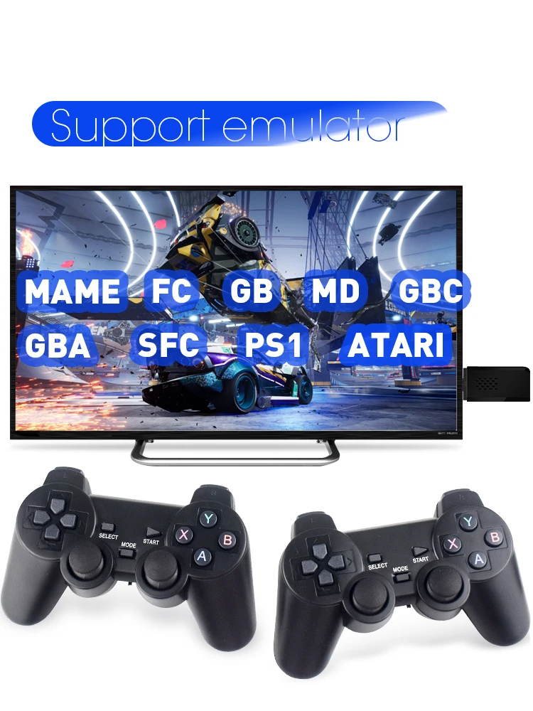 Беспроводная ТВ игровая консоль установлена с более чем 10000 видами богатых игр, установлены 9 эмуляторов, которые поддерживают различные игры, и прилагается карта TF 32GB. Он использует улучшенную игровые фишки для Поддержка 8-битных, 16-бит, 32-бит, 64-бит, 128-bit, а также другие эмуляторы. Он идеально соответствует вашим потребностям в качестве изображения и плавности игрового процесса.