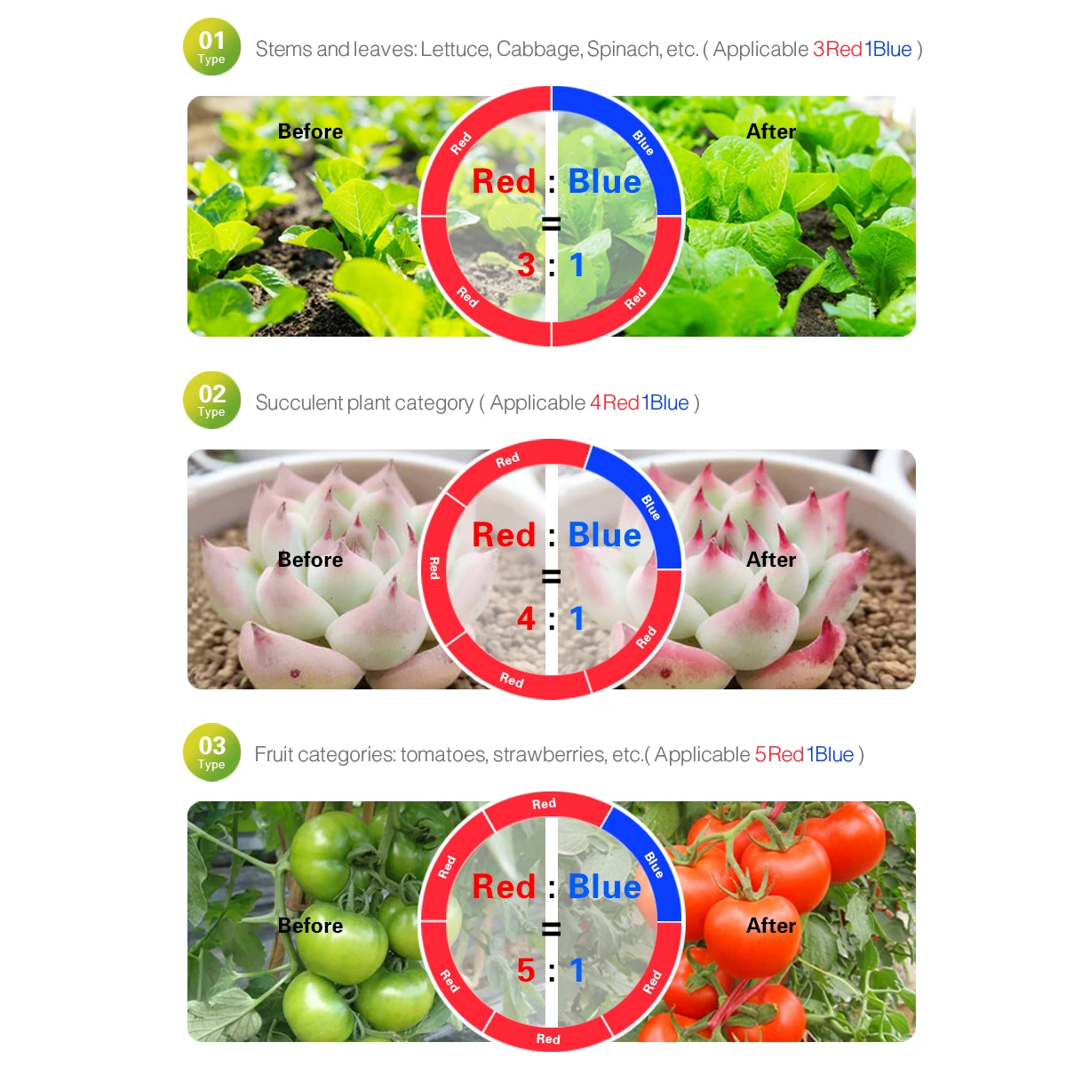 280 нм ~ 315 нм влияние на морфологические и физиологические процессы минимально315 нм ~ 420нм хлорофилл поглощает меньший эффект удара, предотвращает удлинение ствола420 нм ~ 500 нм (синий) хлорофилл и каротиноиды поглощают самую большую долю, самое большое влияние на фотосинтез500 нм ~ 620нм скорость поглощения красителя не высокая620нм ~ 750нм (красный) Скорость поглощения хлорофилла «Высокая», оказывает значительное влияние на фотосинтез и эффект фотохимидаСкорость поглощения 750нм ~ 1000нм, стимулирует удлинение клеток, воздействие цветения и прорастания семян> 1000 нм преобразуется в калории