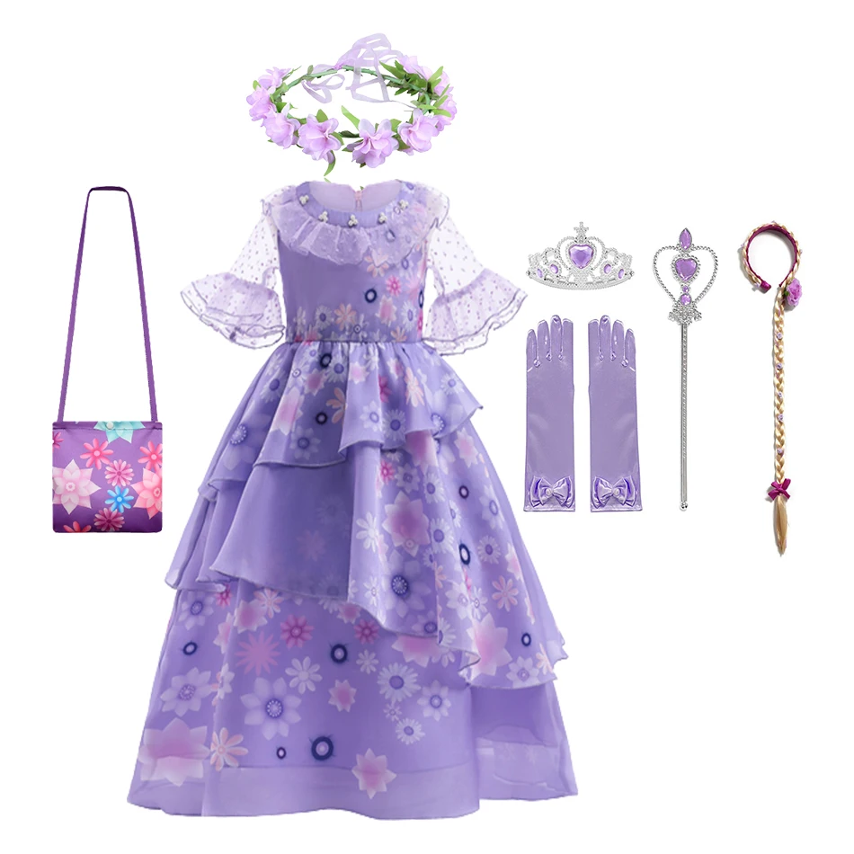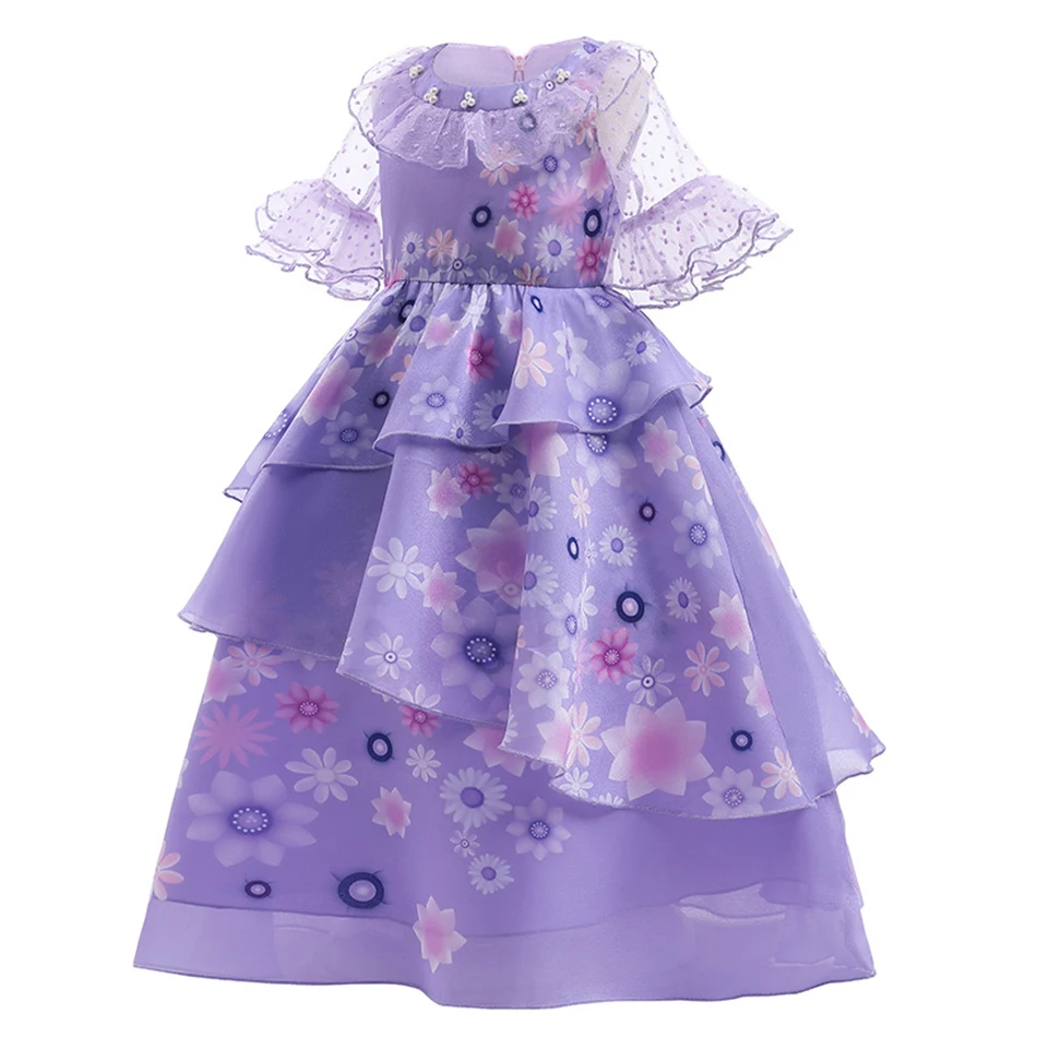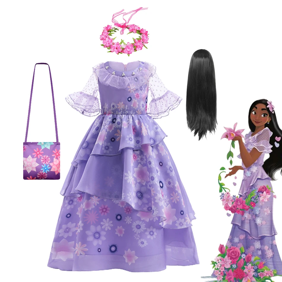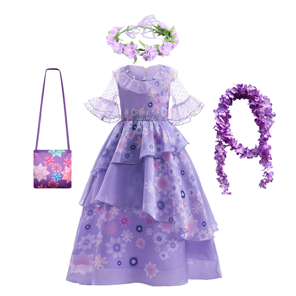Encanto Isabela Madrigal/карнавальный костюм платье для девочек на карнавал, фиолетовые длинные платья принцессы с цветочным принтом и оборками нарядная праздничная одежда