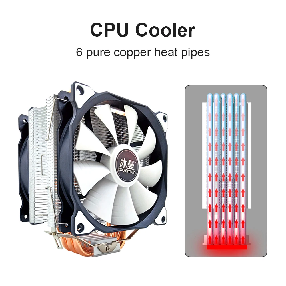 Охлаждающий вентилятор для процессора Снеговик MT6 12 см, 6 тепловых труб из чистой меди, настольный ПК кулер, 4 Pin PWM радиатор для Intel AMDХарактеристика:1. 6 тепловых труб из чистой меди. Тепловая труба имеет двухрядный шахматный дизайн, изогнутая часть гладкая и толстая, а верхний процесс спекания изысканный.2. Увеличьте ребристую группу, Максимизируйте площадь рассеивания тепла, двойную теплопроводность, тепловыделение быстрее и эффективнее.3. Вентилятор контроля температуры 12 см использует гидравлическую технологию и дизайн контроля температуры ШИМ, с большим объемом воздуха и тишиной.4. Первый выбор для дома, офиса, Интернет-кафе и серверов.Спецификация:Название бренда: снеговикМодель: MT6Совместимый процессор: для Intel и AMDРазмер продукта:Одиночный вентилятор: 153X124X85 ммДвойной вентилятор: 153X124 x100 ммМатериал радиатора: медь + алюминийТип: 6 тепловых трубTDP: 180 ВтРазмер вентилятора: 120X120X25 ммСкорость вентилятора: 800-1500 об/минПодшипник: гидравлический подшипникМощность Интерфейс: 4-контактный разъемВентилятор Тип: 4-контактный PWM FanНапряжение: 12 В постоянного токаТок: 0,23a ± 10%Мощность: 2-3 ВтОбъем воздуха: 72CFM (макс.)Шум: 15-25dBA ± 10%Срок службы: 50000 часовДля Intel разъем: LGA 1200/775/1150/1151/1155/1156/1366 (i3/i5/i7/i9)Для гнезда AMD: AM4/AM2/AM2 +/AM3/AM3 +/FM1/FM2 (Ryzen / Athlon / Phenom)Для установки AMD: для AMD необходимо сохранить Оригинальное крепление на вашей материнской плате и просто пристегнуть кулер будет хорошоПримечание:В связи с различиями мониторов и эффектами освещения реальный цвет товара может немного отличаться от цвета на фотографиях. Спасибо!Возможны отклонения в 1-2 см вследствие измерений вручную.