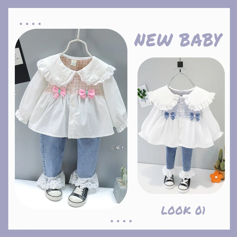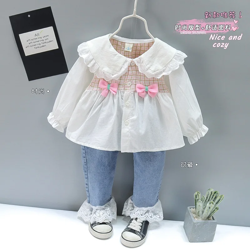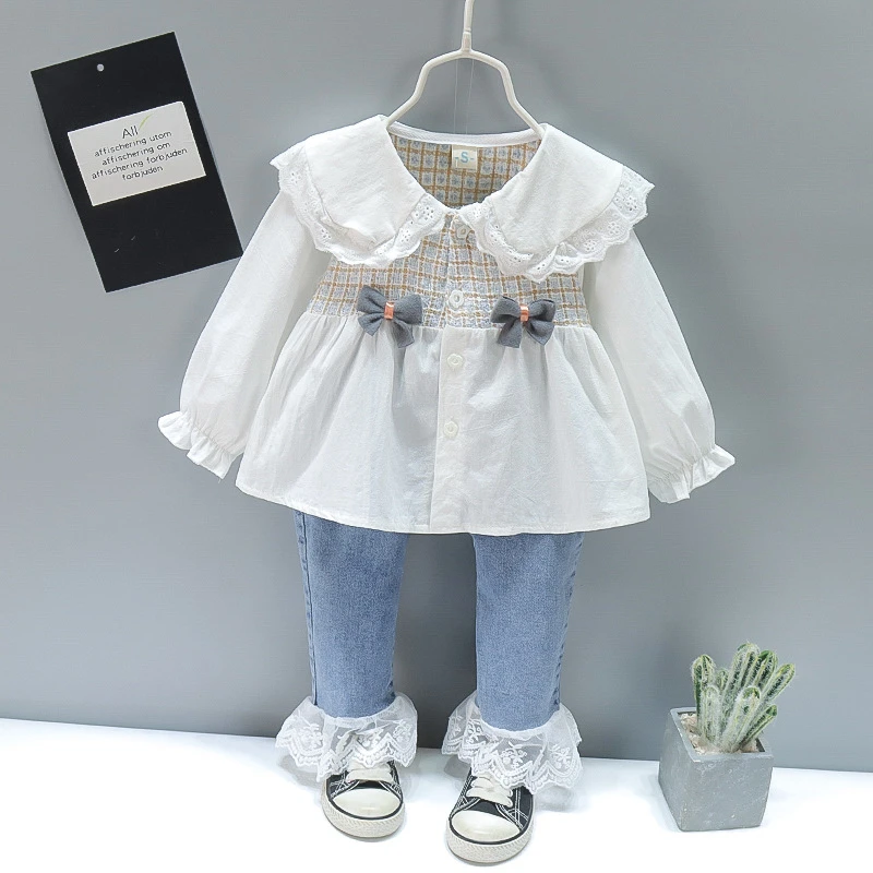 Кружевная одежда со складками для маленьких девочек, популярный милый детский осенний топ + джинсовые брюки, Детский костюм для девочек