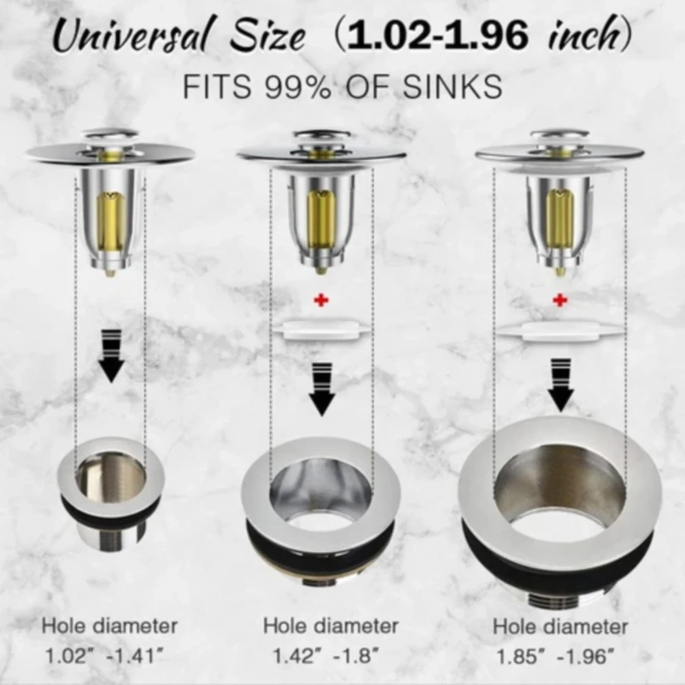 Подходит для 99% раковин для ванной комнаты с сливными отверстиями 1,02-1,96 дюйма. Независимо от того, какой умывальник, сливы для раковины в ванной или сливы для душевой ванны, он может работать со всеми.