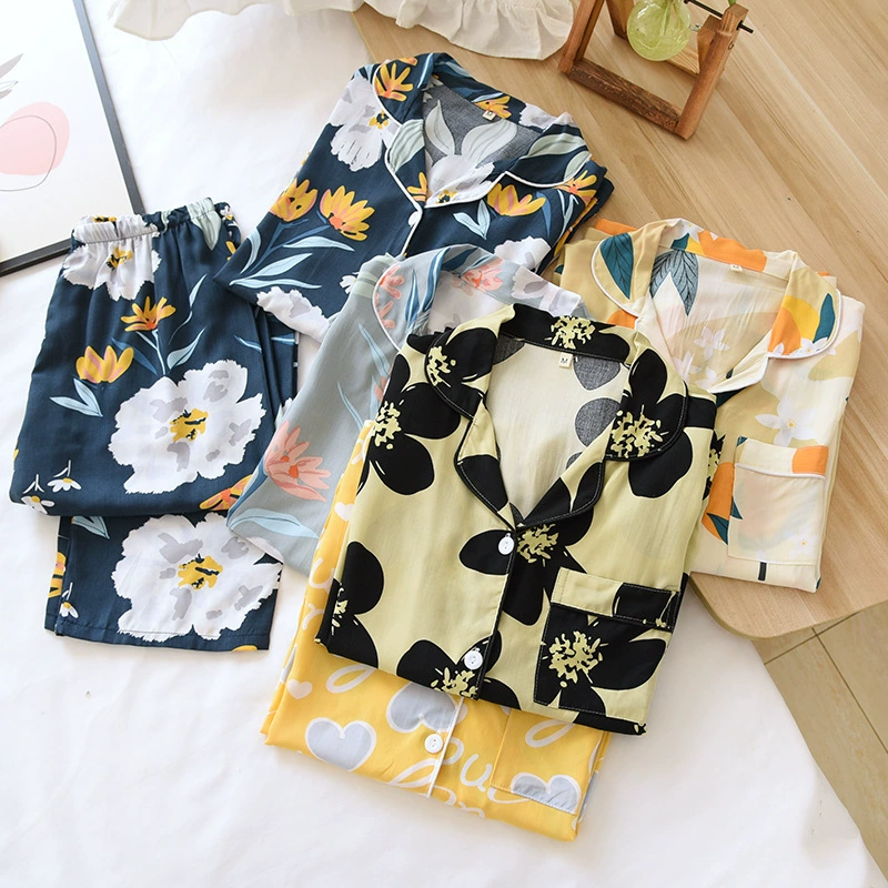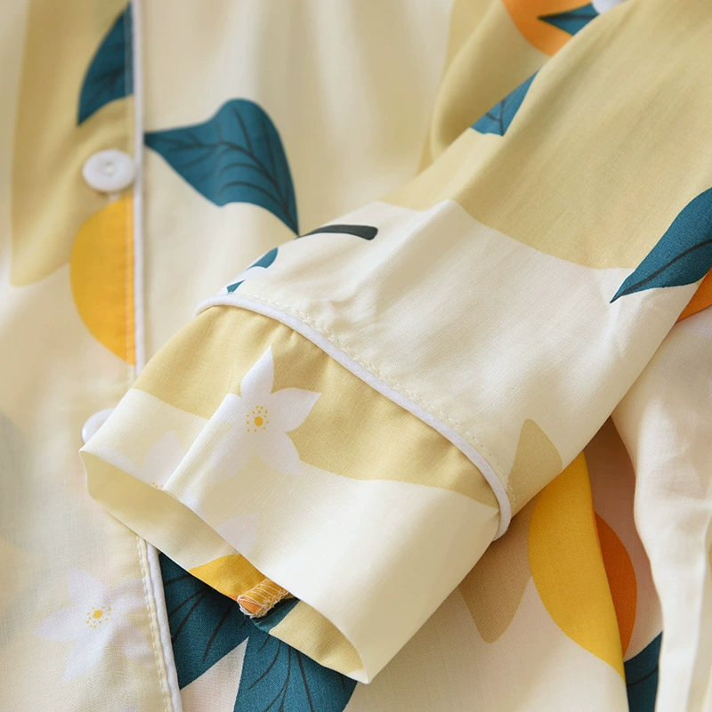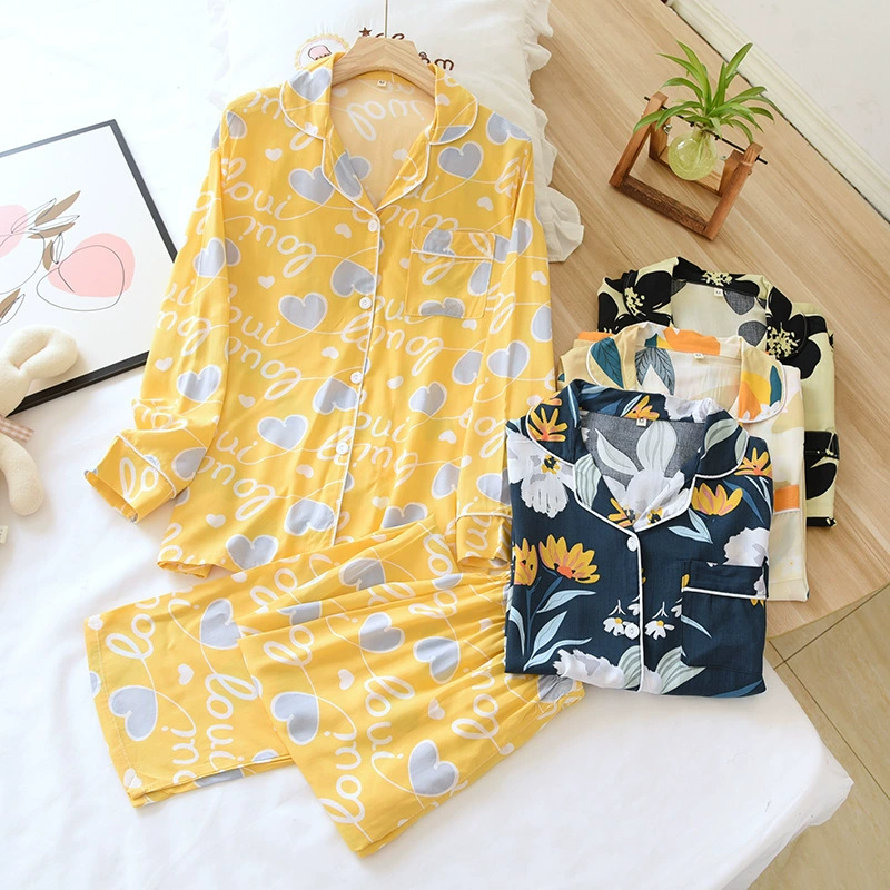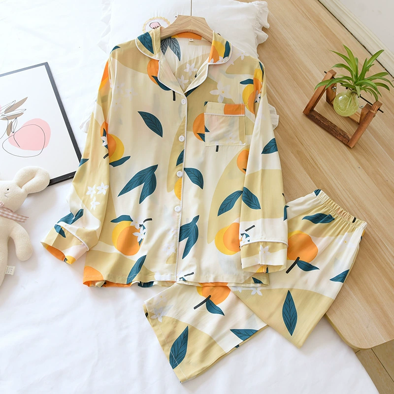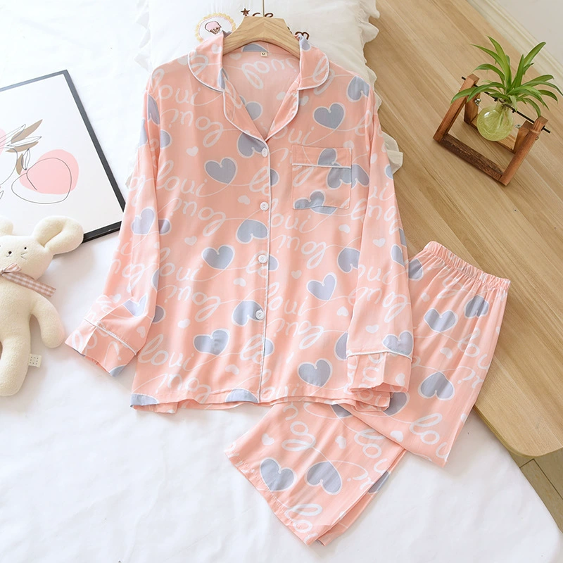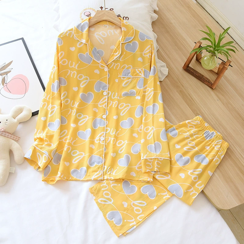 Весенняя вискозная пижама с длинным рукавом, одежда для сна с принтом и лацканами, комплект из двух предметов, летняя одежда для отдыха, свободная Пижама для женщин, домашняя одежда