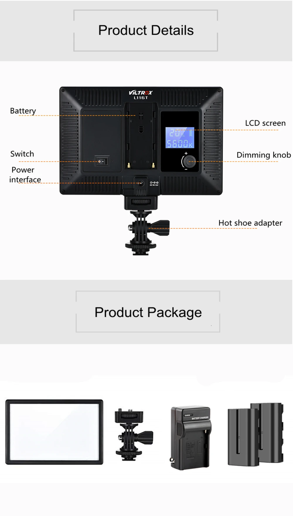 VILTROX L116T светодиодный светильник принимает новейший светодиодный дизайн сот. Он обладает высокой яркостью, естественным и мягким освещением, стабильной цветовой температурой. Подходит для портретов/детей/свадьбы и т. Д.ЖК-дисплей высокой четкости обеспечивает четкость рабочего интерфейса,Вы можете регулировать яркость и цветовую температуру бесступенчато.Горячий башмак принимает прочный металлический плинтус.Его можно установить на DSLR , DV видеокамеру и штатив.