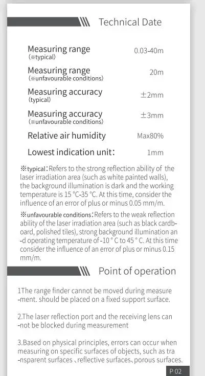-Малый объем, измеряет расстояние, площадь и громкость точно, быстро и удобно. -Широкий диапазон измерения 40 м с высокой точностью до ± 2 мм, точный и эффективный.