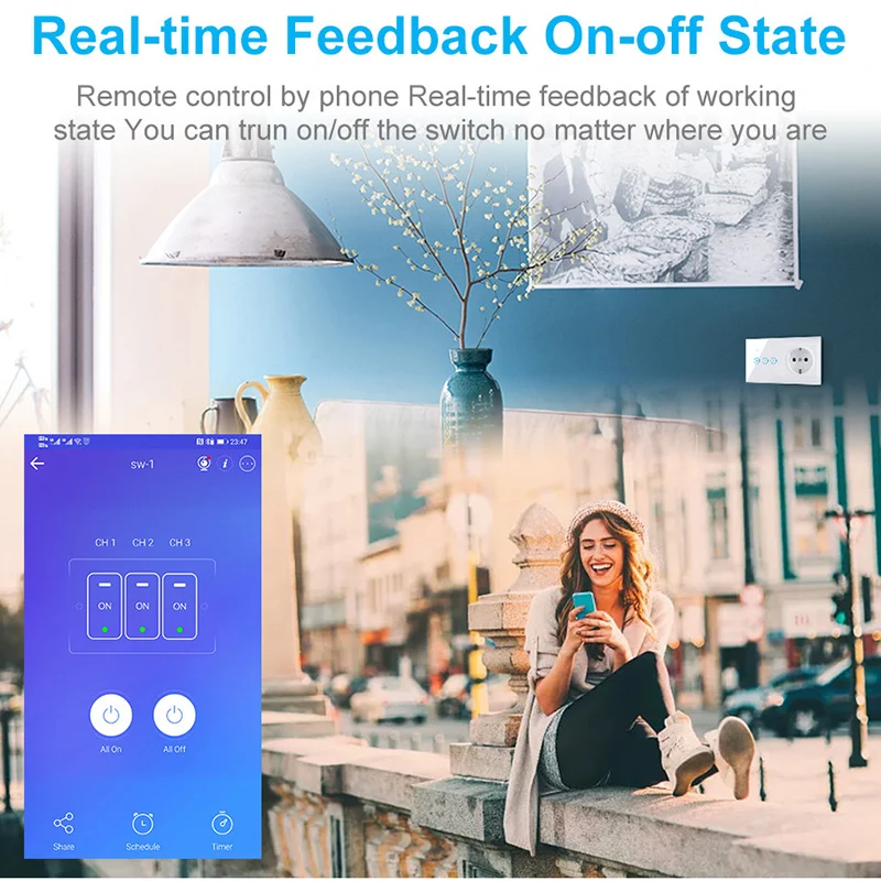 Пользователь может использовать смартфон для удаленного управления домашней электроникой удаленно в любое время, В любом месте, пока телефон имеет сеть 2G / 3G /4G/ WIFI, совместимая с операционной системой iOS и Android с eWeLink