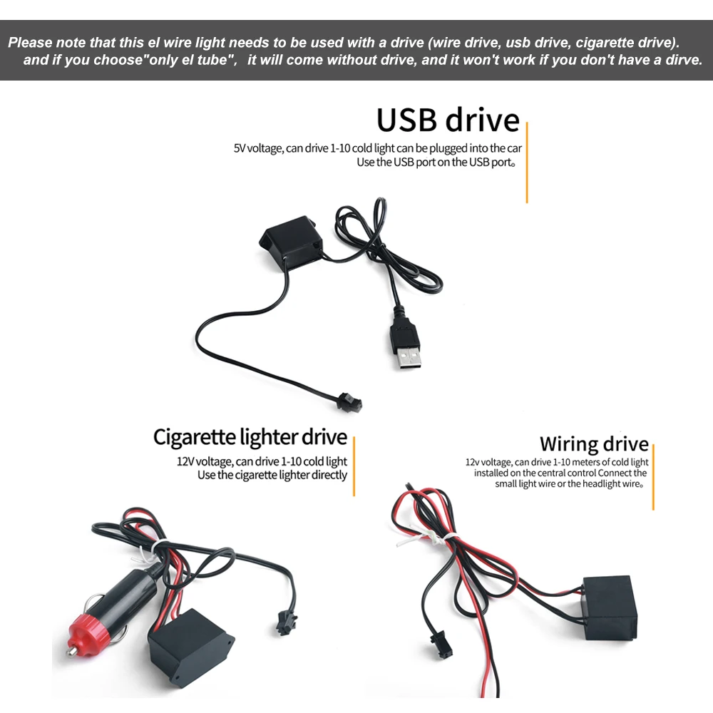 Обратите внимание, что этот светильник el wire должен использоваться с накопителем (провод, usb-накопитель, сигаретный накопитель). И если вы выберете «только el tube», он придет без привода, и он не будет работать, если у вас нет грязи. Спасибо!