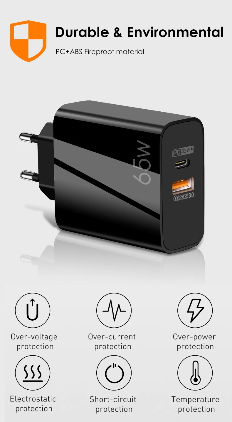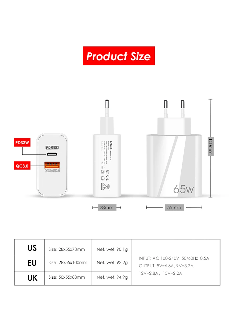 [Быстрая зарядка или нет]: QC 3,0 зарядка 32 Вт + PD 33 Вт (65 Вт)[Материал изделия]: АБС-пластик;[Размер товара]:Стандарт США: 55*28*75 мм; [размер металла]Европейский стандарт: 55*28*100 мм; [размер металла]Британский стандарт: 55*28*75 мм; [размер металла][Вес изделия]: стандарт США 48 г, европейский стандарт 48 г, британский стандарт 49 г; [вес металла][Входные параметры]: AC100-240V 50-60 Гц; 0.5A[Выход параметры]: 5V/6.6A, 9В/3.7A,12V/2.8AUSB-A + PD Общая мощность: 5 В/4 а Макс.