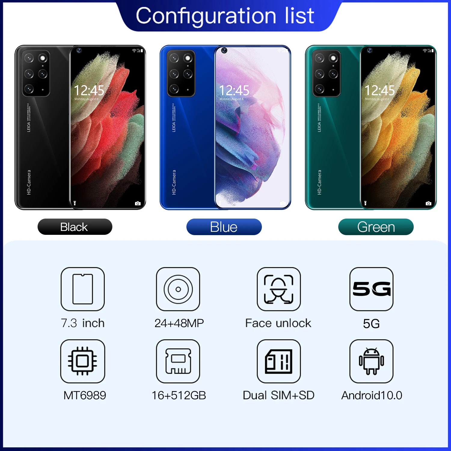 Смартфон глобальная версия S21 Ultra, Android 7,3 дюйма, 16 ГБ, 512 ГБ, смартфоны, сотовый телефон, разблокированные мобильные телефоны, мобильный телефон