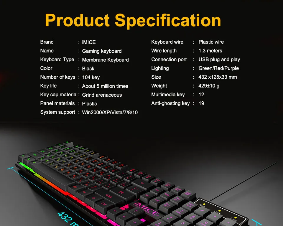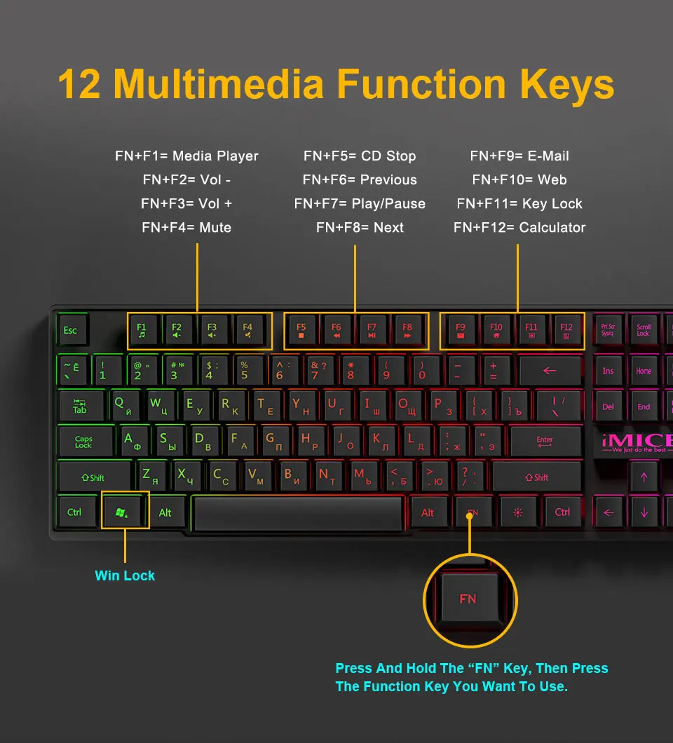 13 комбинаций мультимедийных клавиш, 26 клавиш без коллизии, укрепляет пробел. 13 комбинаций мультимедийных кнопок, удобных для вашей работы или игры, и повышения эффективности. Эргономичный дизайн, эргономичные изогнутые колпачки, гладкие линии, комфортные ощущения и защита от усталости. Идеальная игровая клавиатура с подсветкой для игр и офиса