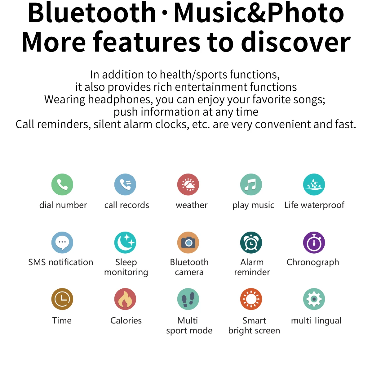Монитор сердечного ритма, монитор сна, кровяное давление, вызов по bluetooth (совершать звонки, принимать звонки) и напоминание о сообщениях, удаленная музыка/камера. Будильник, секундомер