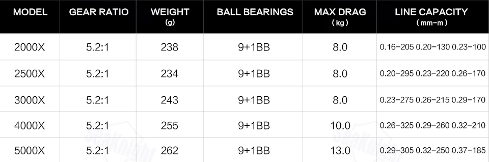 2000S X | Вес: 46 г | Емкость линии: 0,14-80 0,16-602500S X | Вес: 52 г | Емкость линии: 0,16-110 0,20-703000S X | Вес: 57 г | Емкость линии: 0,20-105 0,23-804000D X | Вес: 58 г | Емкость линии: 0,26-325 0,29-2605000D X | Вес: 60 г | Емкость линии: 0,29-305 0,32-250 0,37-185