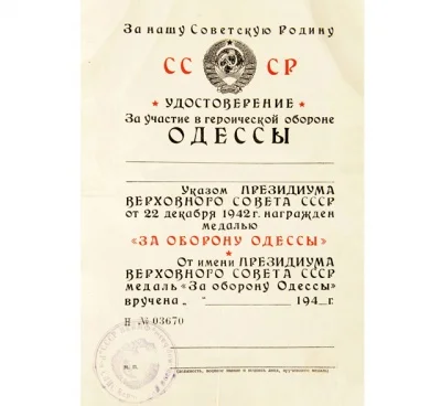 За оборону Одессы 1942 удостоверение к медали СССР, копия арт. 20-16556 icon star icon star icon star icon star icon star