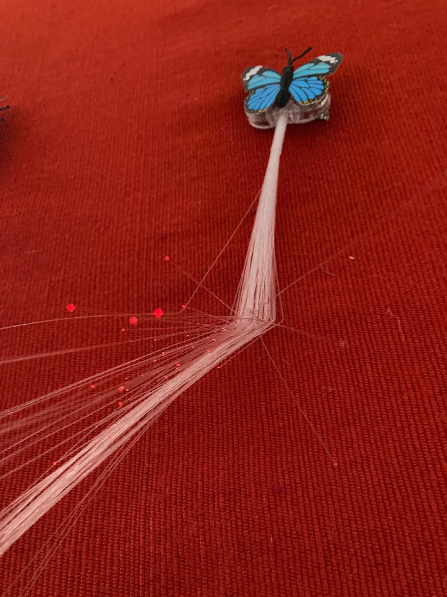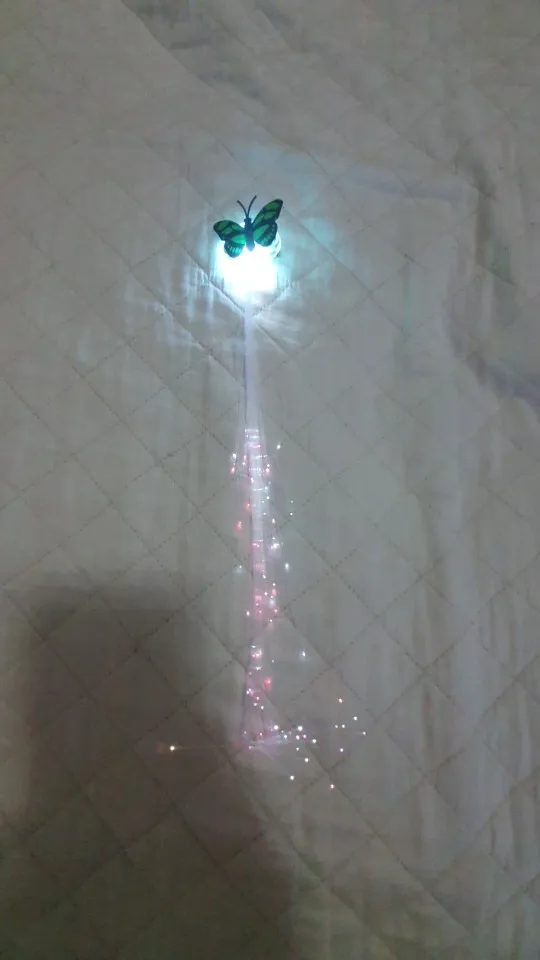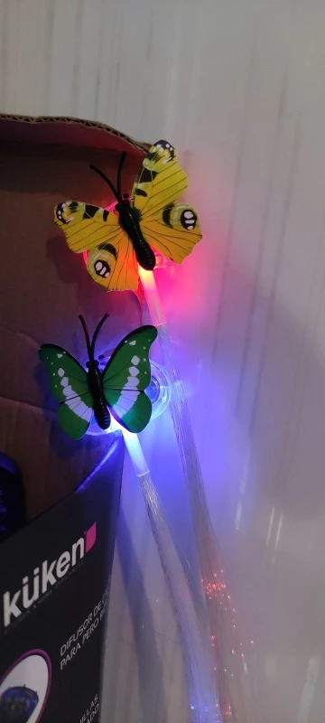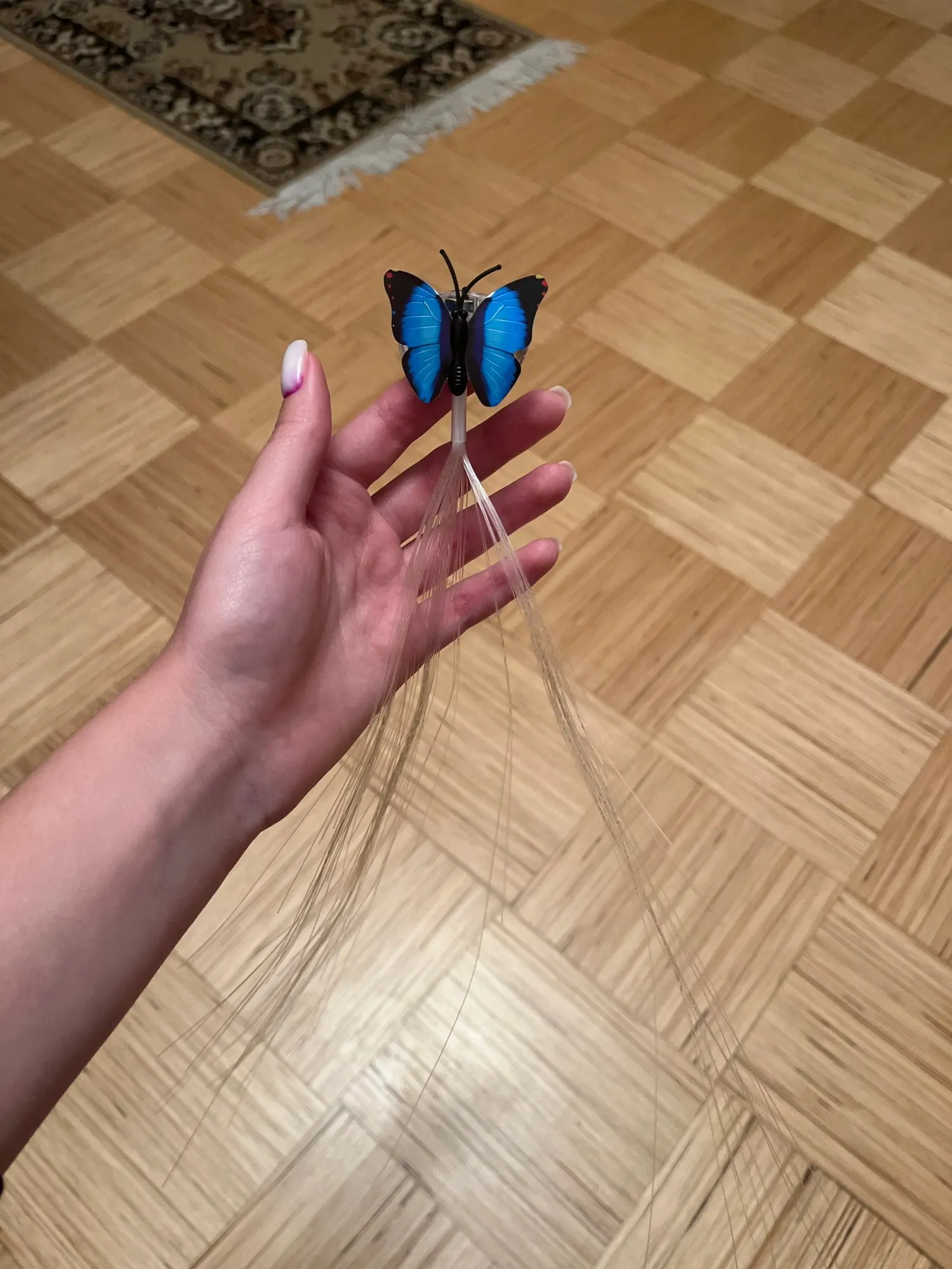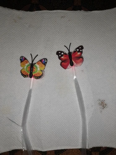 Очень красивые заколочки. Заказывали 2 штуки, прислали с разными бабочками. Светятся, на волосах держатся, но нелегкие.