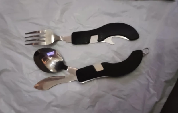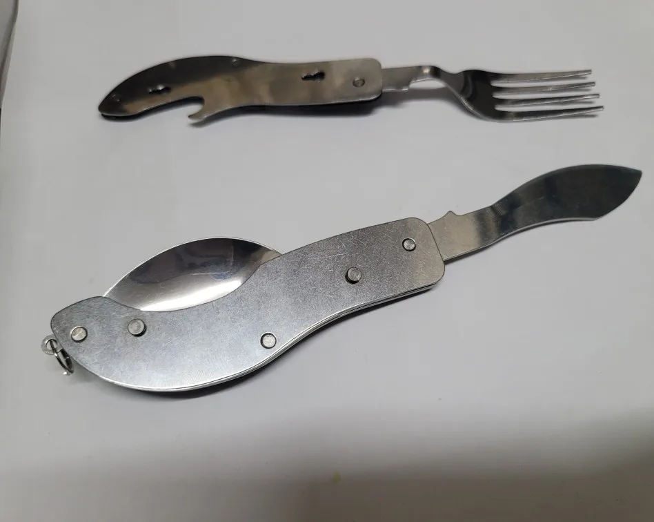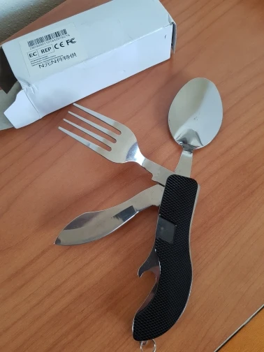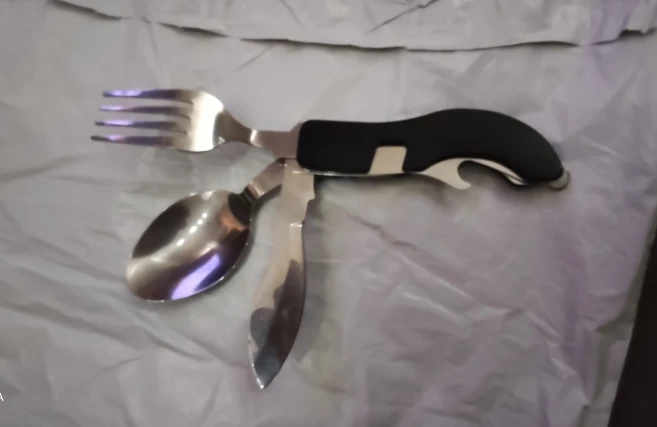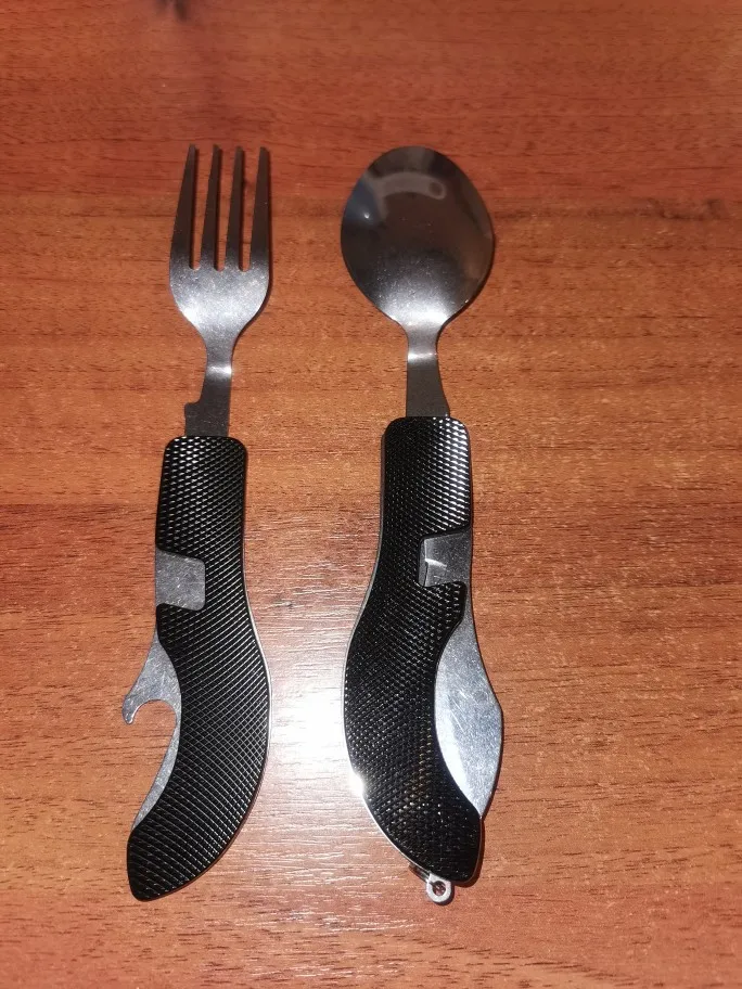 Хорошая полезная штука, металл нормальный. Ложка и вилка отделяются- ими можно пользоваться отдельно. А нож только вместе со всем комплектом. Есть также отрывашка для бутылок. Получила в составе объединённой посылки, где все по 1,92 и бесплатная доставка. Отправили в тот же день, доставка за 15 дней.