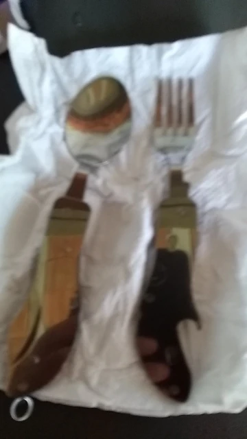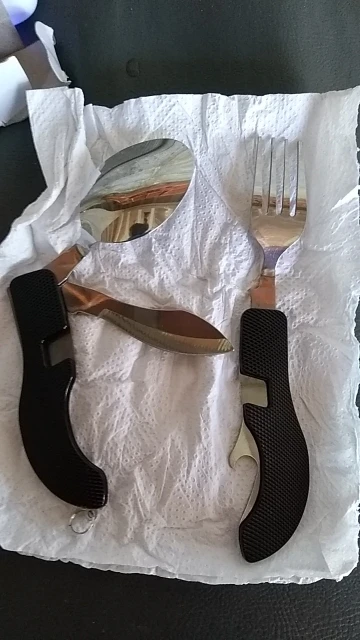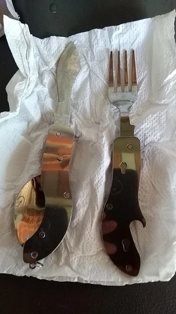 Прийшло десь близько місяця на укрпошту, замовляв 3 товара по 2. Крута річ, десь для потягу в дальній дорозі чи для кемпінгу. на виживання в ліс з палаткою. все якісне і не пахне. вилку можна відєднати, ложка десертна, кінці вилки були гострі заточив напилком. ніж тупиватий, але теж підточив, отже на 75 гривен товар шикарний, зараз вони по 112, дочекаюсь коли буде по 75 ще замоалю. Рекомендую товар і продавця.