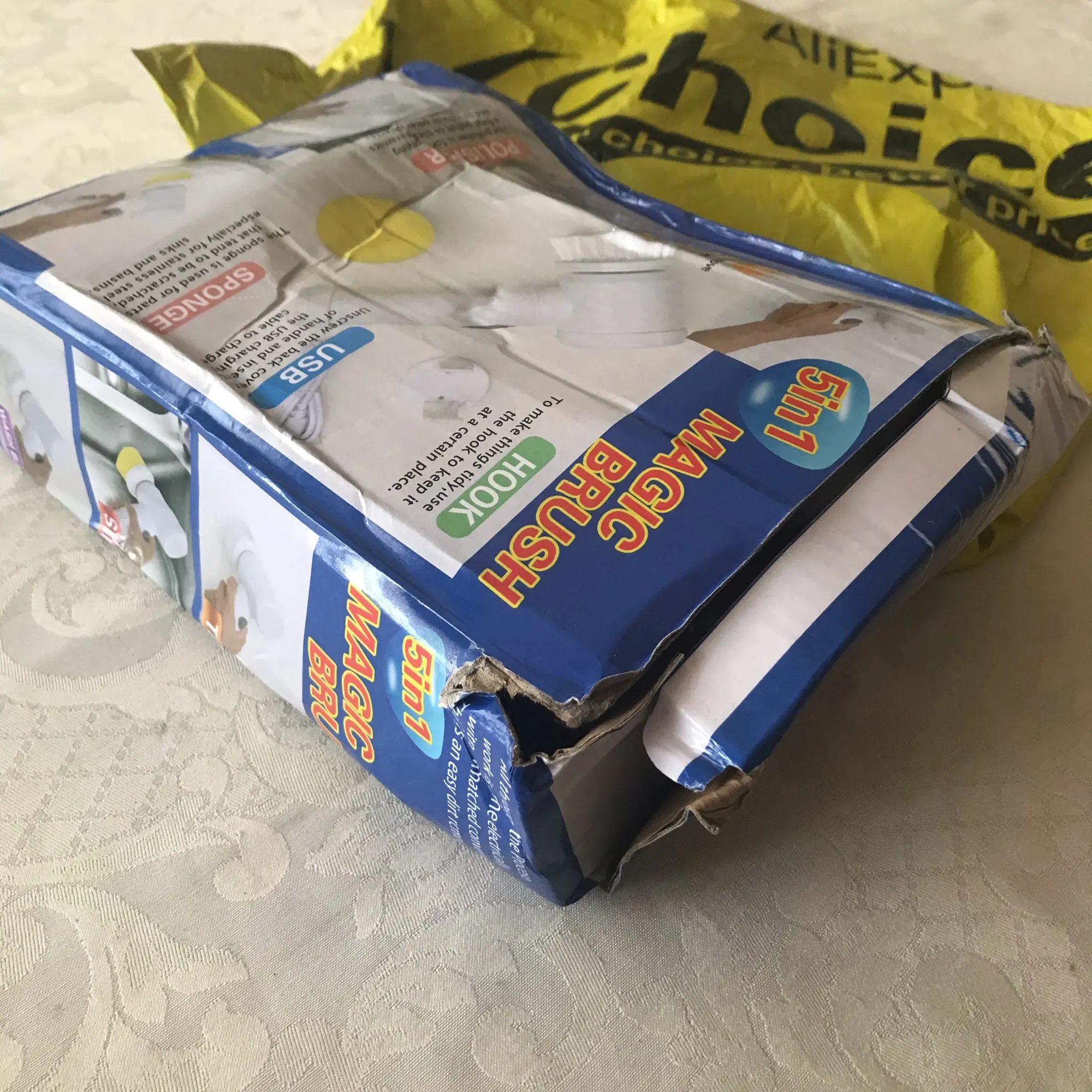 Посылка прибыла быстро. Поврежденная коробка. Кисть немного загружена по прибытии и работает.