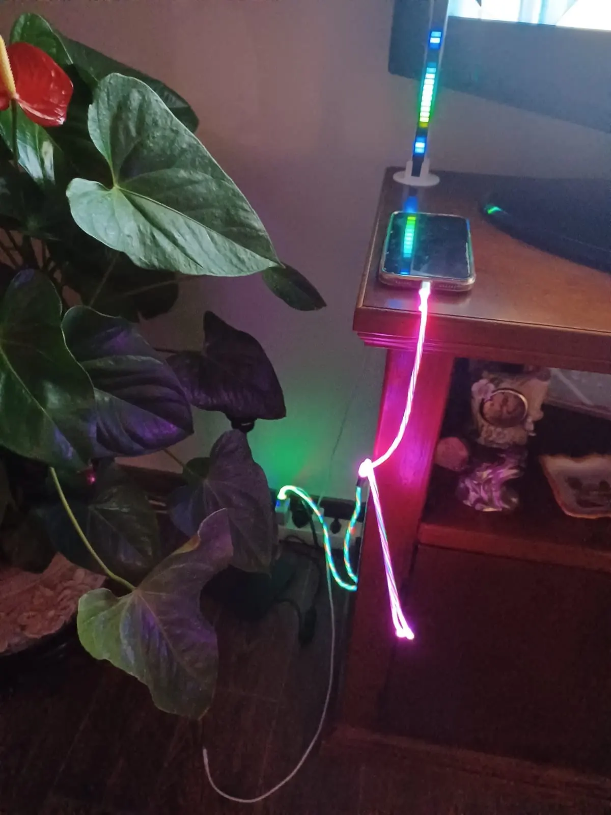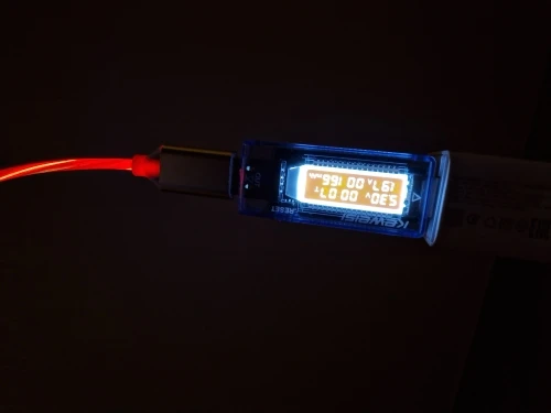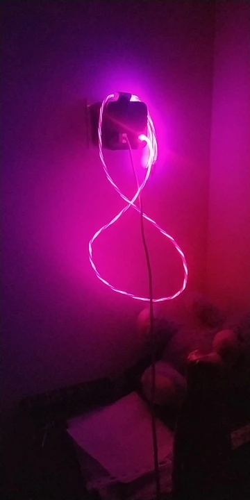 Кабель їхав місяць часу, світиться зажди як тільки підключити до живлення як грилянда, зарядка йде на 1 ампер, споживає світло 0,15 ампера