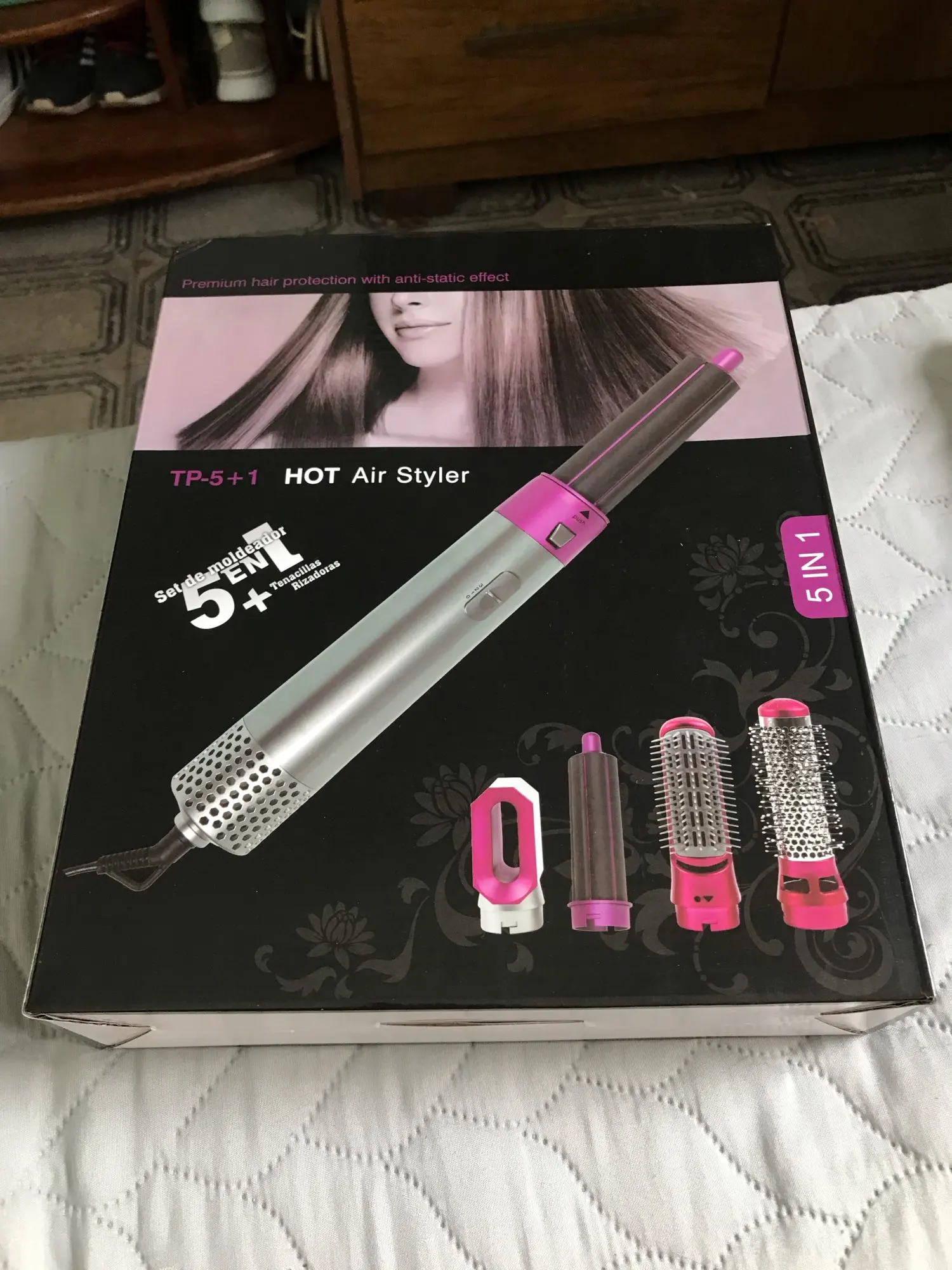 Прибывает через 15 дней, хорошо упакованный в картонную коробку. К минусам разочарован продуктом, Я высушил волосы с помощью Вышивки кисти, которая хорошо сидит. Круглая щетка наконечника плохо держится и гладкая наконечник бесполезен. Что касается петель, то есть две наконечники, чтобы сделать в обоих направлениях, но результат не так определен, если железо для петли, это дает движение, но это не имеет ничего общего с красивыми кудрями... продукт также шумный, вы должны знать. Мое общее мнение, я предпочитаю использовать мой выпрямитель или кнопку, я ожидал лучшего. Результат я потратил 30 € ни за что.