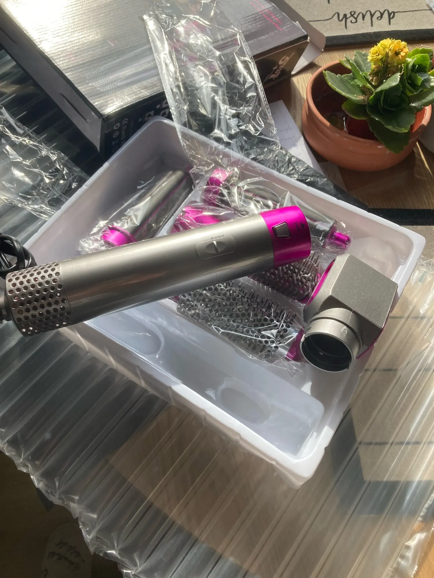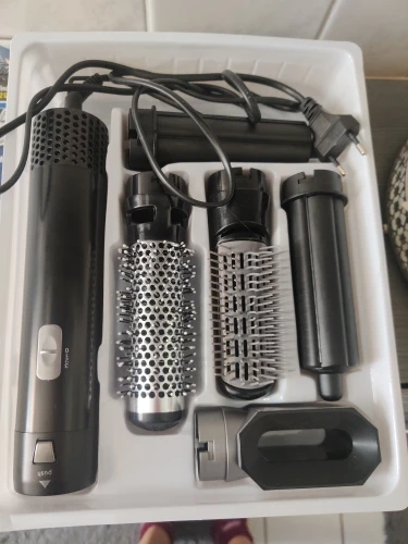 Товар прибыл заранее. Как я уже читал из других обзоров, все это сделано более или менее пластиковым. Телефон просто включился Немного пахнет, после чего со сменой головок и использованием около 10 минут вы больше не можете слышать. Я использовал его только для выпрямления волос и создания складок, что я обычно делаю с помощью кисти. Могу сказать, что это здорово, хорошо работает, не обжигает кожу, но при этом нагревается и сохнет. Кроме того, у меня больше нет боли в руке, так как я использую только инструмент, чтобы сделать складку. Я пытался в скорости использовать инструмент, чтобы сделать локоны, кажется, работает хорошо, но, к сожалению, я не получил, чтобы проверить его еще полностью! Однако стоит купить весь этот набор, потому что даже если это не Дисон, он работает очень хорошо!