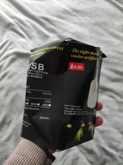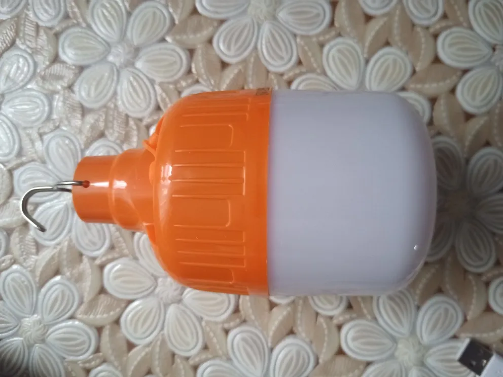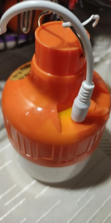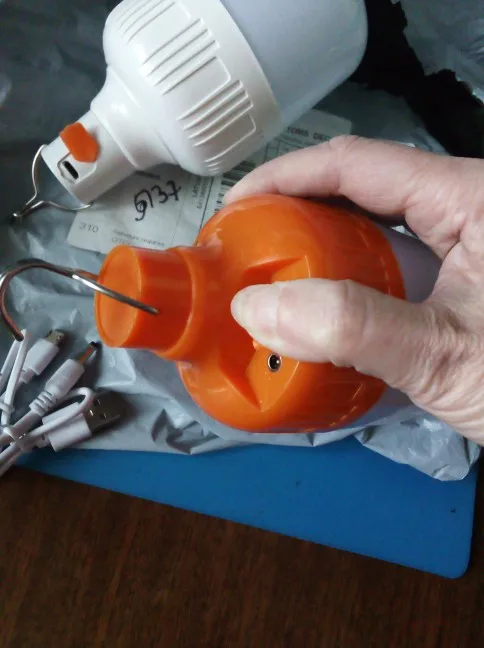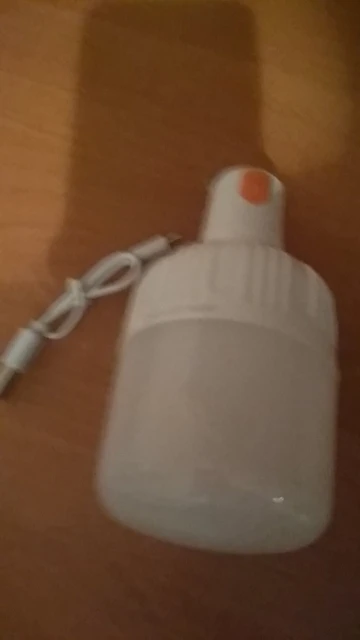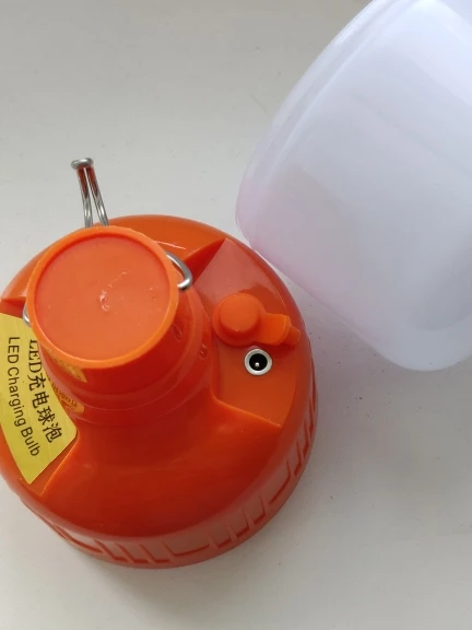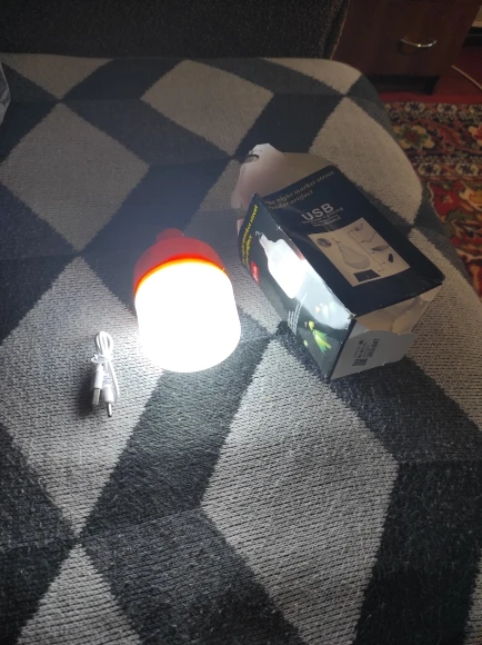 Замовила лампу з помаренчовою верхньою колбою і не додивилась, що шнур для зарядки не з міні юсб (на другому кінці). У випадку його пошкодження чи відмови у роботі - будуть проблеми з пошуком саме такого типу (штекер дуже тоненький). Є сумніви в його роботі, бо під час заряджання від нього йде запах гуми (паленої). Стосовно роботи - на самому яскравому світлі працює близько 2 годин, потім поступово зменшується яскравість. В нуль розрядити дуже важко, бо може жевріти на слабенькій підсвітці (як свічка) ще годин 5. Заряджається від півтори години, в залежності від рівня розряду акумулятора. Освітлення максимальне, якщо підчепити за гачок повище в кімнаті. Три режима освітлення, перемикається гумовою кнопкою біля роз'єму для зарядки. Анонсованої продавцем фірми ніде не вказано. Єдина позначка вибита ємність 80 ват на корпусі.