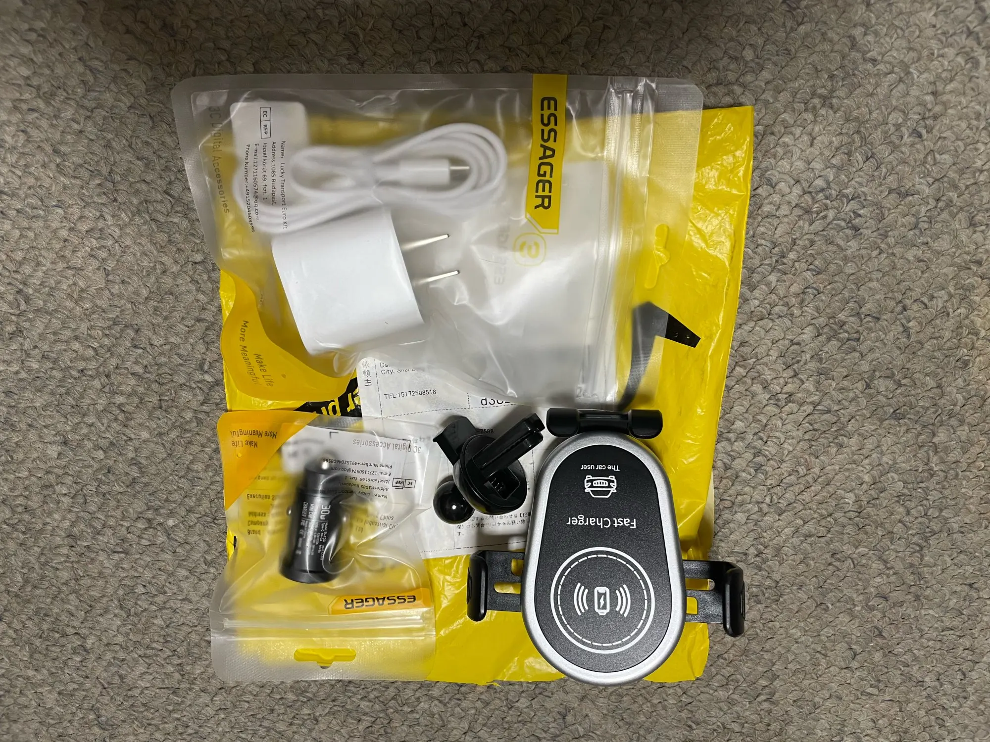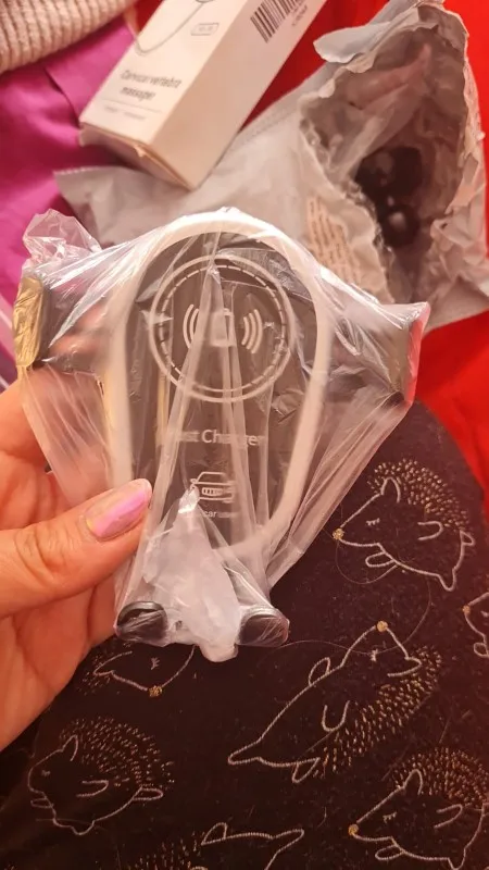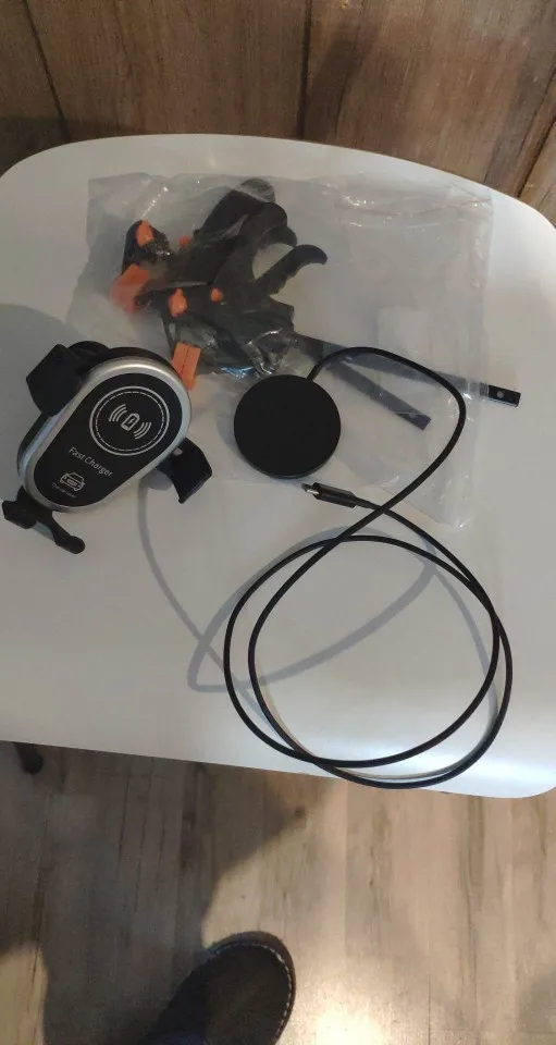 Посилка по їхала за три тижні. Зарядка працює, в комплекті відсутній провід Туре-С. Якість пластику середня, але за 2$ зарядка і тримач телефону піде. Рекомендую.