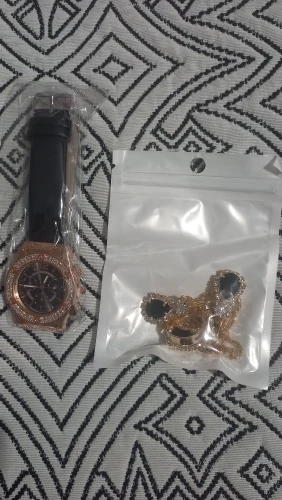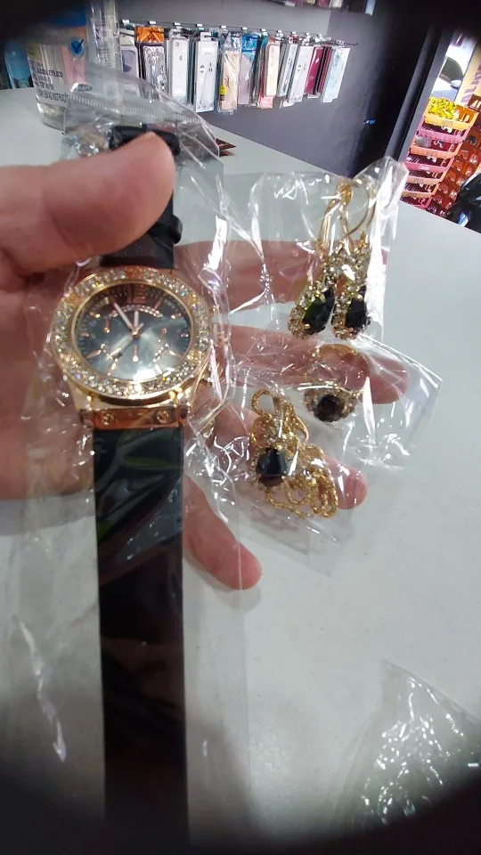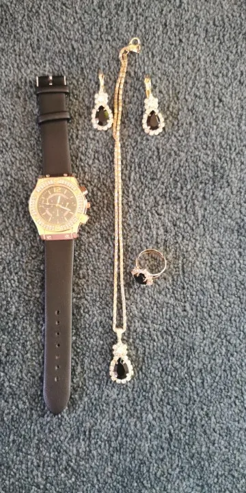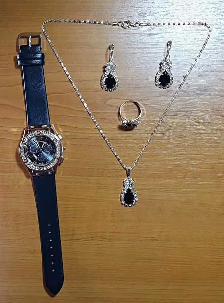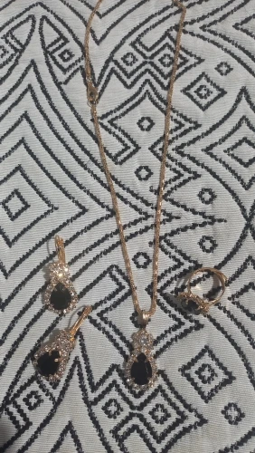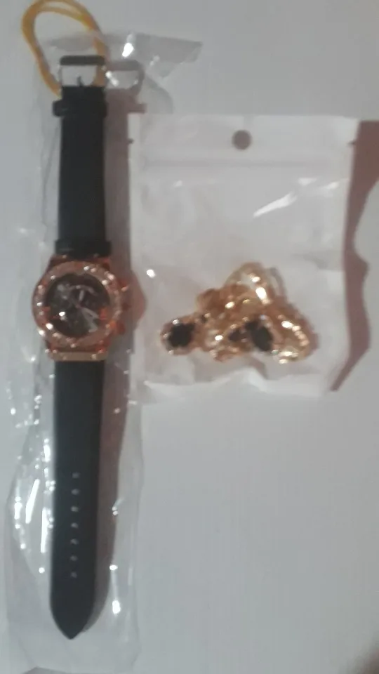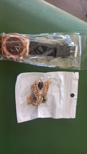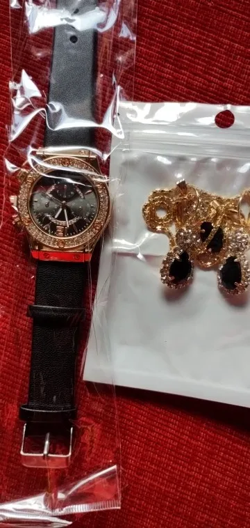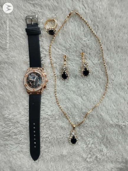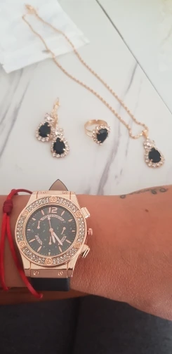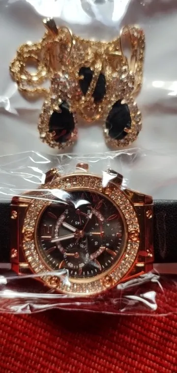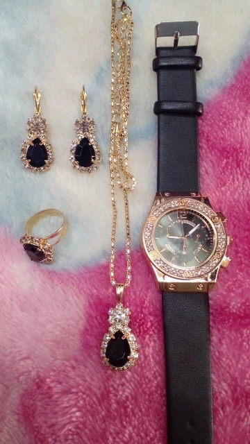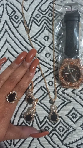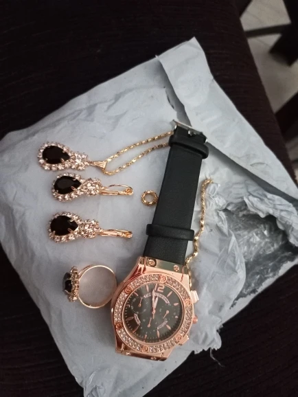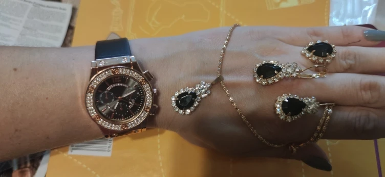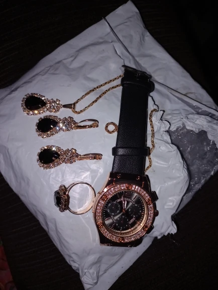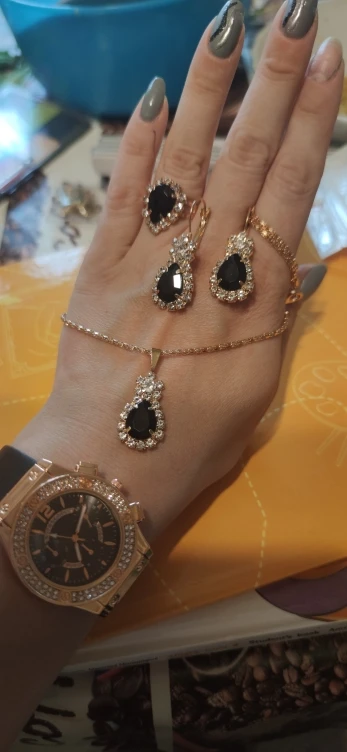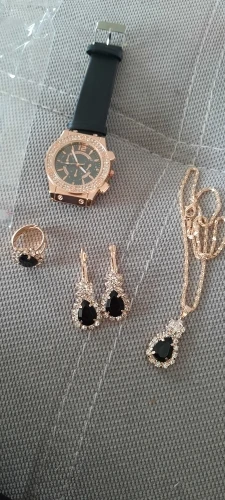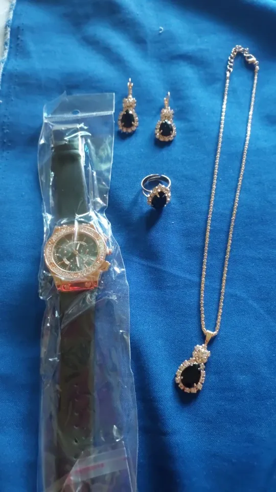 Заказан 02.04.2023, получен 26.04.2023. Часы выглядят очень красиво, кольцо регулируется, ожерелье немного маленькое, но кулон и серьги, а также кольцо имеют очень красивый дизайн с черной каплей воды, окруженной стразами. Набор выглядит стильно, и я рекомендую его.
