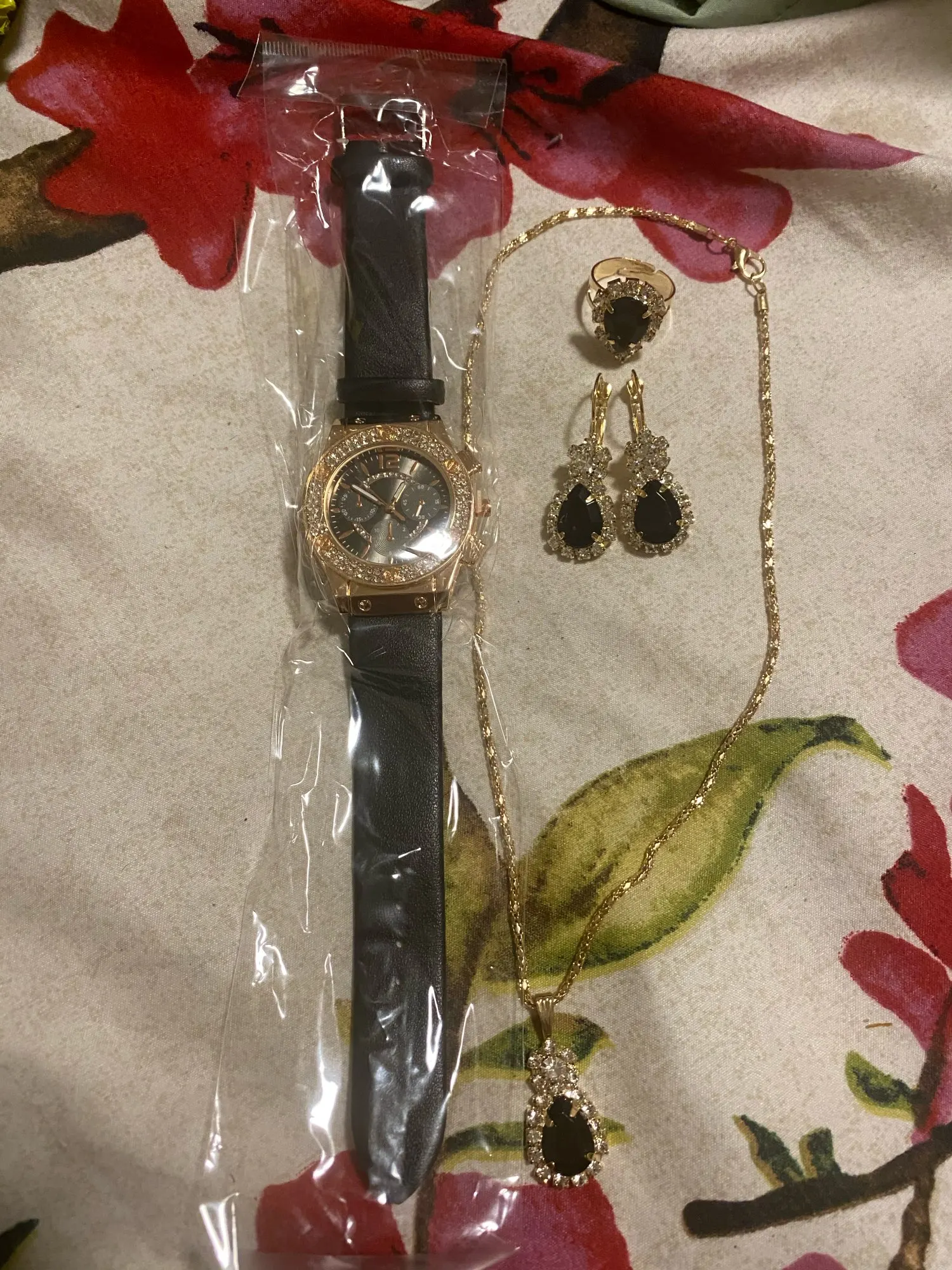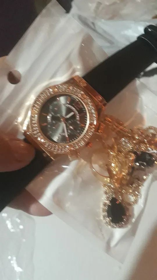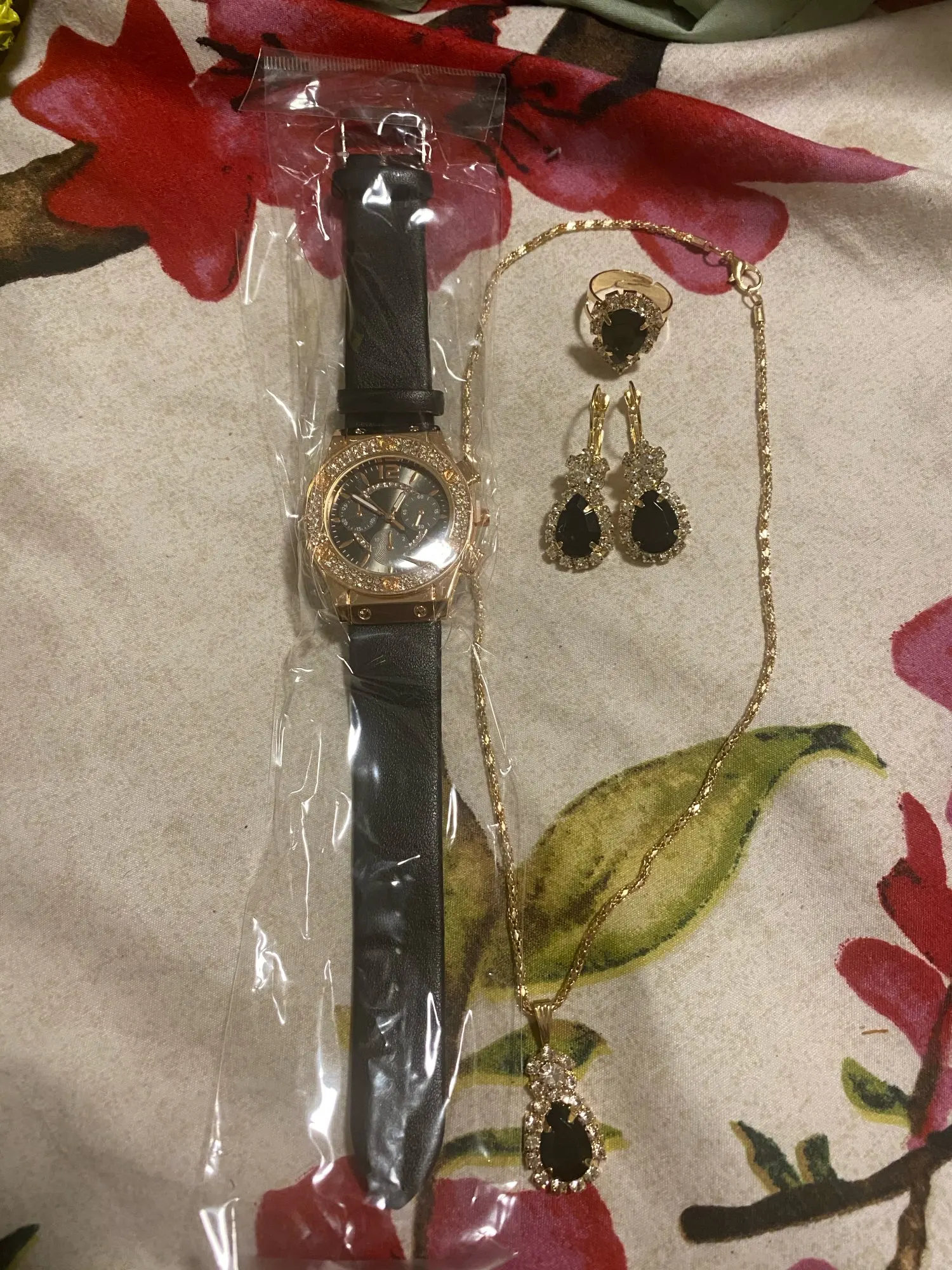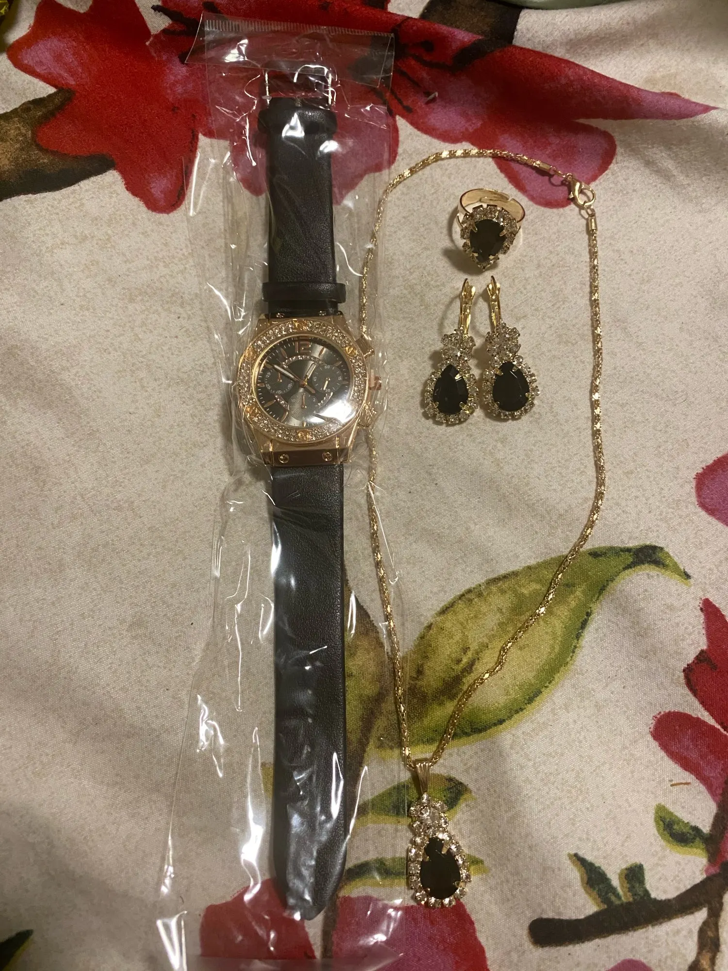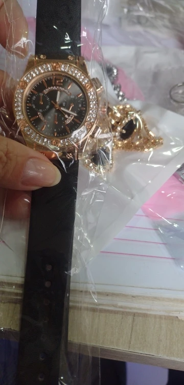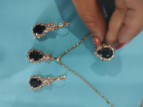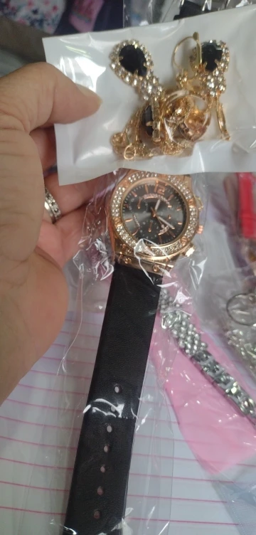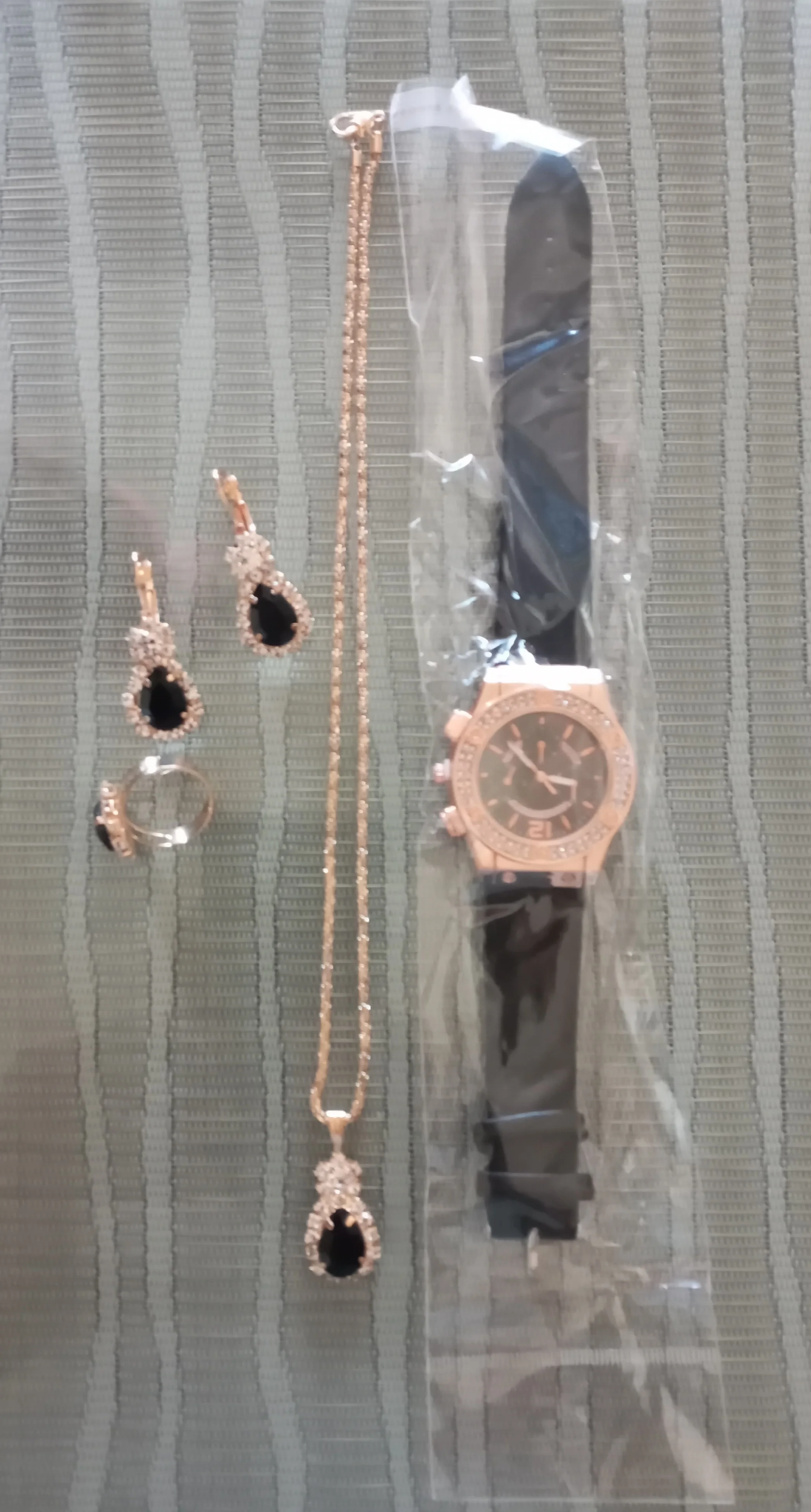 Заказан 02.04.2023, получен 26.04.2023. Часы выглядят очень красиво, кольцо регулируется, ожерелье немного маленькое, но кулон и серьги, а также кольцо имеют очень красивый дизайн с черной каплей воды, окруженной стразами. Набор выглядит стильно, и я рекомендую его.