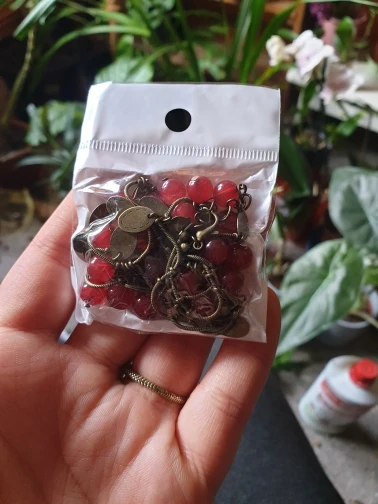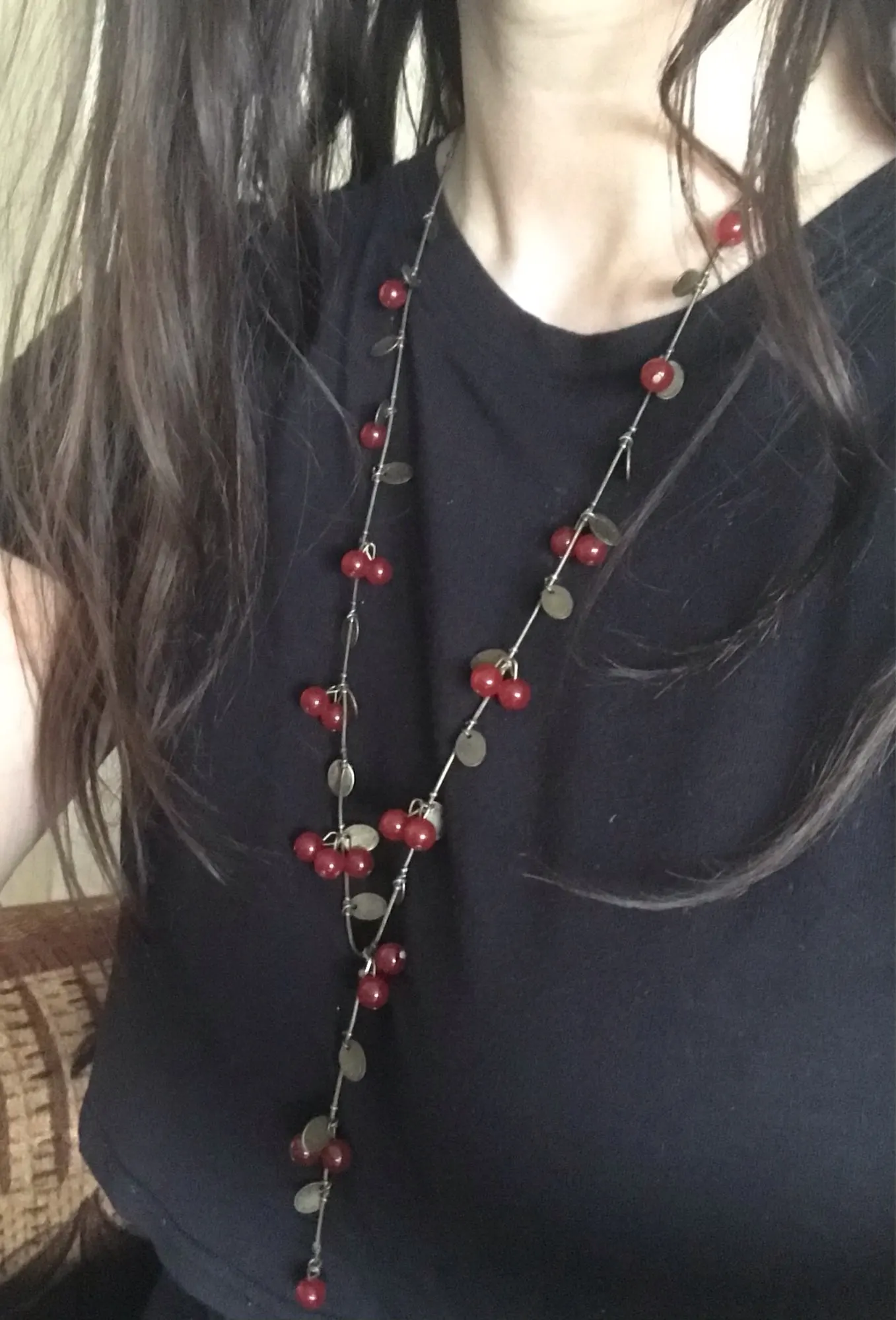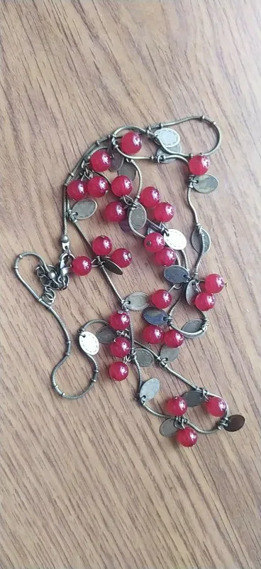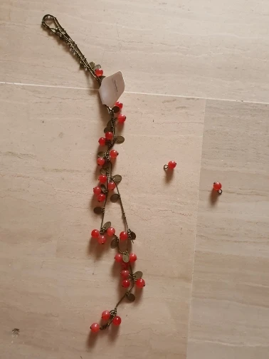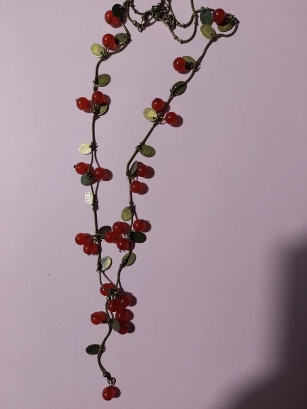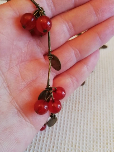 Симпатичная вещь. Довольно изящная, нежная. Нравится. Шнур весь металлический. Бусинки - пластик или смола, темно-красные, очень похожи на ягоды красной смородины в реале. Доставка в Беларусь оказалась быстрее обычного, меньше месяца. Бросили в почтовый ящик.