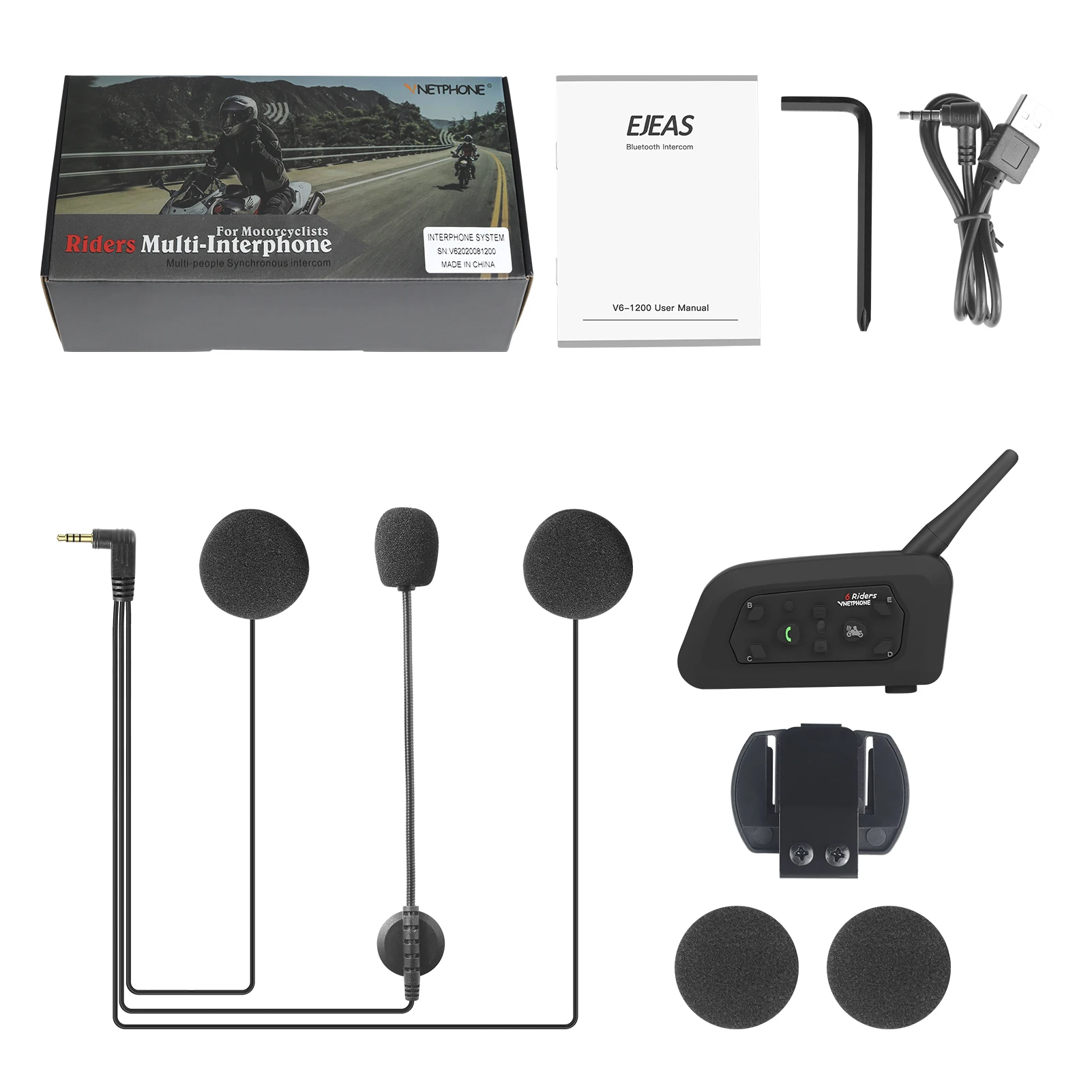 1 х V6 гарнитура Основной блок1 х проводной микрофон1 x Универсальный зажим для шлема1 x приклеенная поверхность крепления Adater1 x Руководство пользователя1 x губки для микрофона1 х крышки динамиков1 х шестигранный ключ2 винта для зажим для шлема1 х USB Мощность и кабель для передачи данных (3,5 мм Тип)