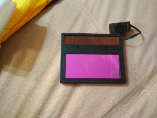 Стекло пришло целое, в маску село хорошо. Реагирует на сварку, вспышки и солнечные блики. В момент срабатывания середина стекла немного темнее верха и низа. Контакты на батарее пришлось подогнуть, чтобы четче срабатывало.
