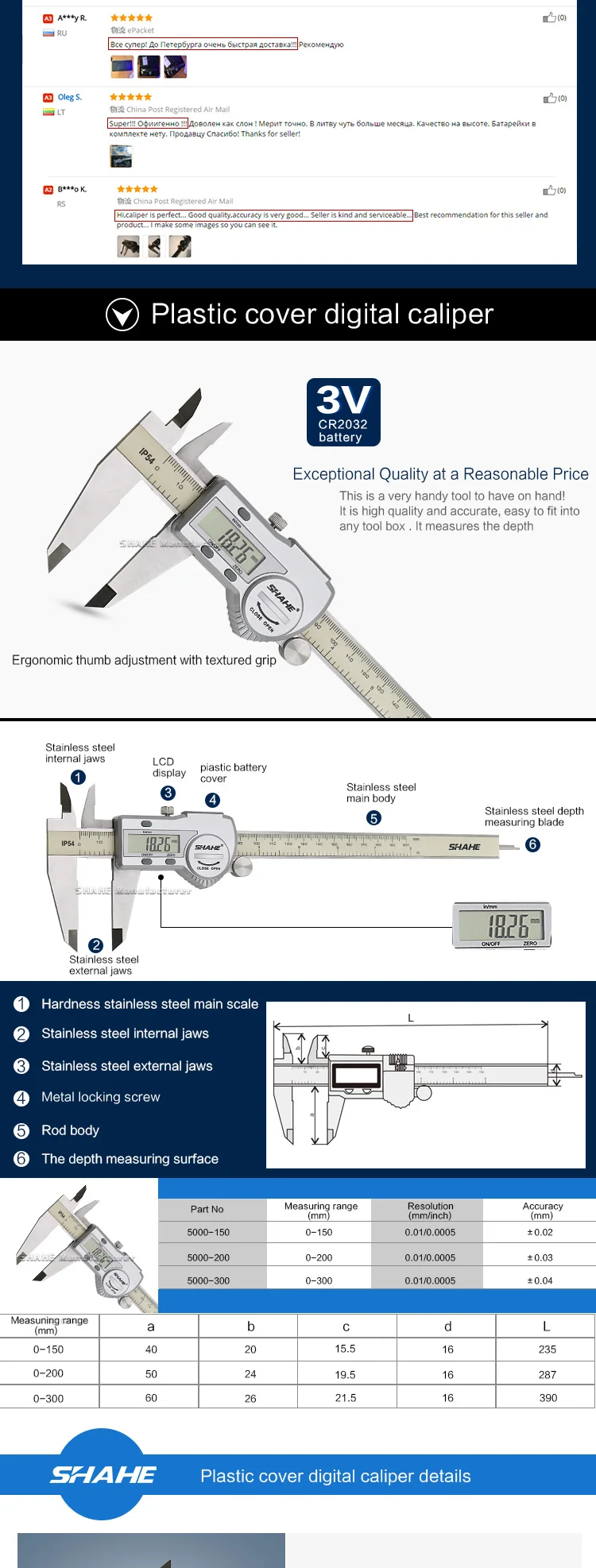 1.Закаленная нержавеющая стальОсновная шкала и измерительная челюсть.2. Нулевая Настройка в любом положении3.Конвертация измерительной системы мм/дюйма4.IP54 Водонепроницаемый.Его полная герметичная структура модуля, обеспечивает его с определенной устойчивостью к воде, маслу и охлаждающей жидкости5.Типы измерений: внутренние размеры, внешние размеры, шаги и глубинаИ так далее6. Высококачественный большой ЖК-дисплей7. Максимальная скорость измерения: 3000 мм/сек8. Класс А Электростатическая защита9.С функцией вывода данных,Интерфейс USB позволяет передавать данные на принтер или компьютер для обработки и печати данных10. Стеклянная фиксированная зернистость, стабильная и высокая точность