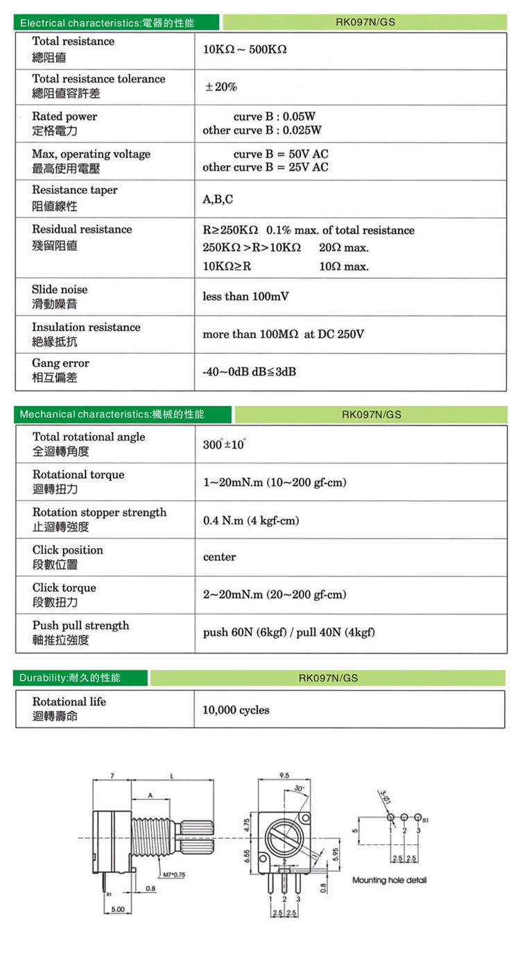 RK097N 5K 10K 20K 50K 100K Ом аудиоусилительуплотнение одиночного подключения потенциометры 3 контактадлина ручки: 15 мм с гайкой