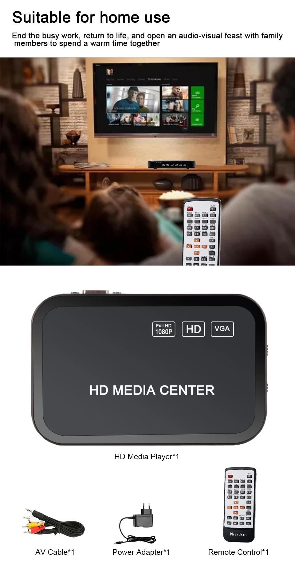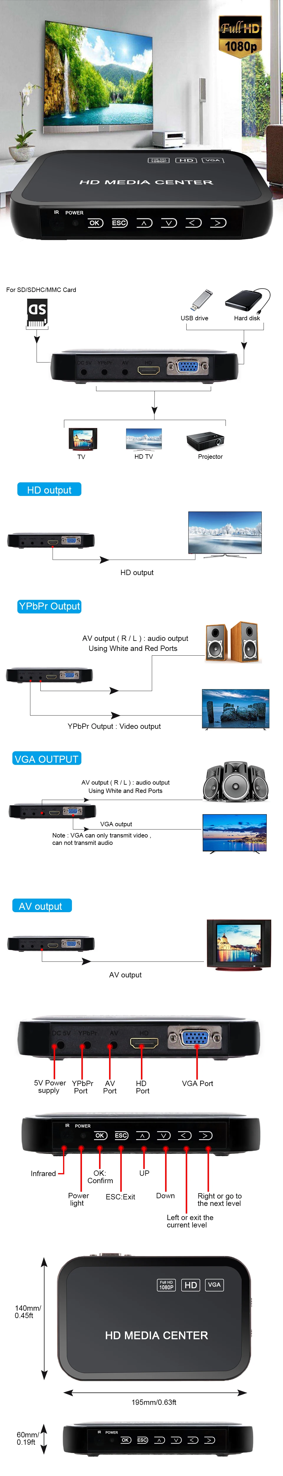 Этот медиаплеер full HD 1080P с пультом дистанционного управления может поддерживать различные форматы видео, музыки, изображения и субтитров. И может поддерживать много различных языков. Имеет интерфейс AV, HD, YPrPb и VGA для вывода видео. Он может считывать все файлы, хранящиеся на SD/ SDHC/ MMC-карте, USB-диске, жестком USB-диске и т. д. он прост в установке и удобен в использовании.