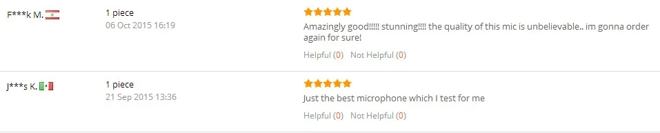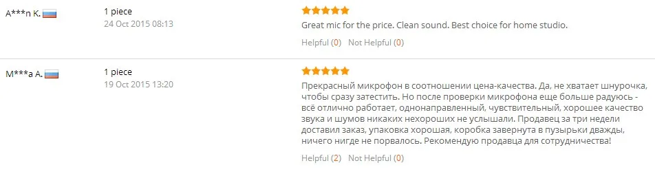 посылка пришла быстро около трёх недель, качество микрофона на высоте , даже не ожидал , в паре со звуковой картой беренджер у2 звук бомба, всем советую к покупке.