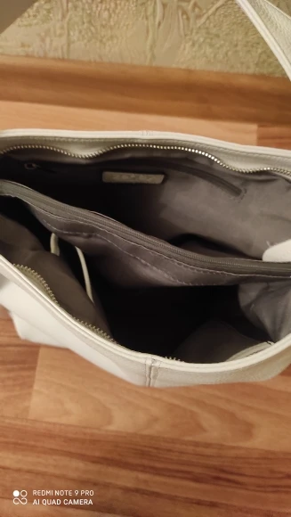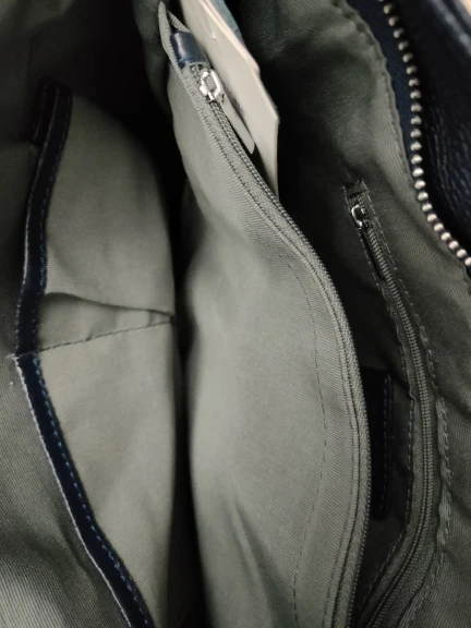 Первое впечатление- разочарование. Выглядит грубо.Кожа ненатуральная !!! Кожаные вещи принимают свой первоначальный вид, если помялись. В данном случае нет(даже пресс не помог).Серая подкладка ,ремень наплечный,металлические молнии удешевляют модель.
